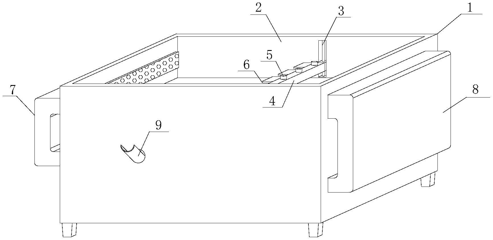 一种毛巾染色装置,包括:浸染池,浸染池内部设立有加工区,浸染池内且位于加工区底部设立有底槽,底槽内部连接有混合箱,混合箱顶部侧壁固定连接有加料箱,浸染池相互远离的两个端侧壁上分别固定连接有接收管和注料管,本实用新型具有以下优点:通过水泵能够使染液产生流动,从而对毛巾造成冲刷,而毛巾处于不动状态,能够想成与染液的相对运动状态,从而能够将染液更加均匀的侵染在毛巾上,且的驱动电机和螺杆能够更加方便的对横板的升降进行操作,从而便于将染后的毛巾取下。