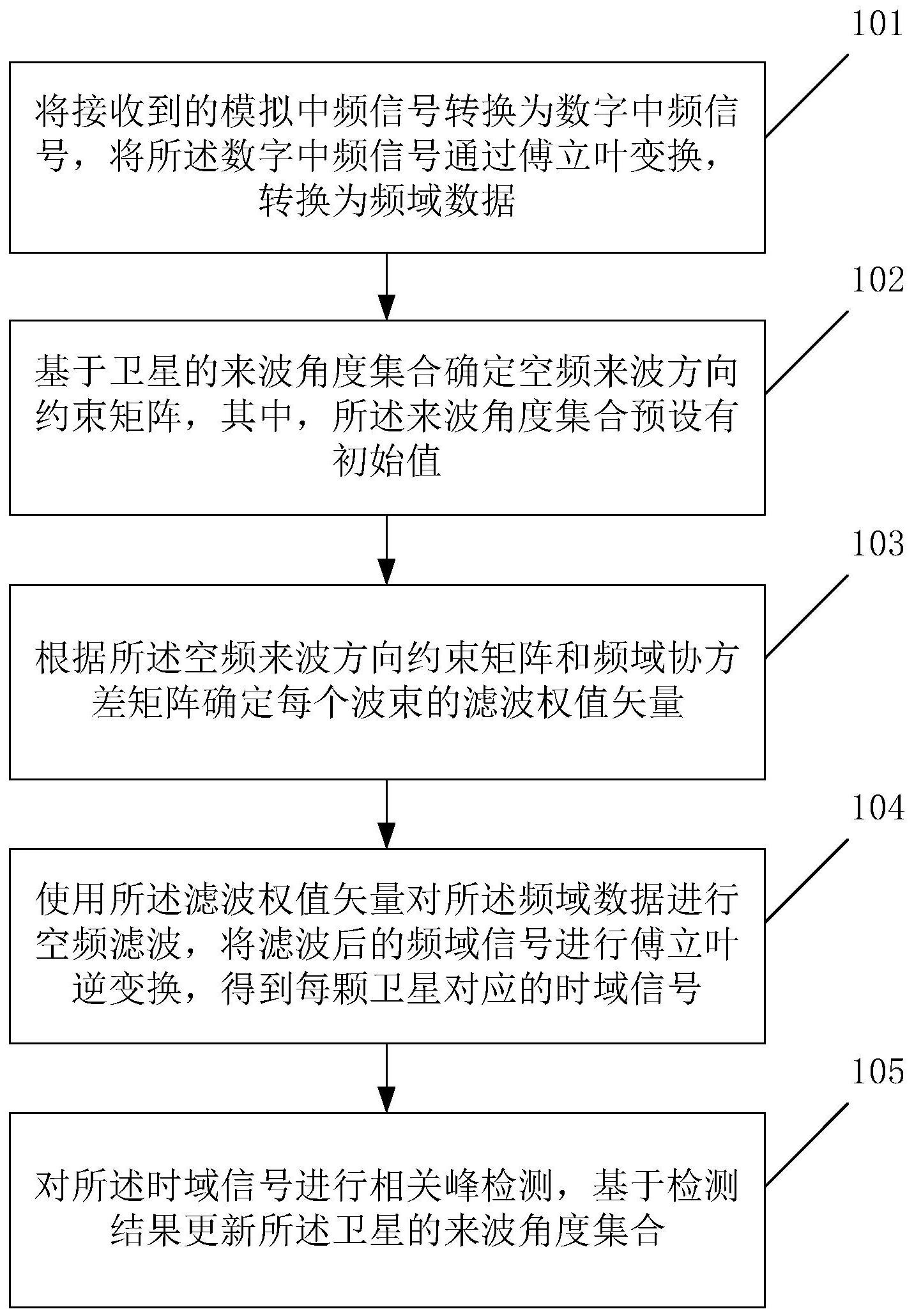 一种数字多波束天线处理方法、装置、设备和计算机可读存储介质,其中,所述方法包括:将接收到的模拟中频信号转换为数字中频信号,将所述数字中频信号通过傅立叶变换,转换为频域数据;基于卫星的来波角度集合确定空频来波方向约束矩阵;根据所述空频来波方向约束矩阵和频域协方差矩阵确定每个波束的滤波权值矢量;使用所述滤波权值矢量对所述频域数据进行空频滤波,将滤波后的频域信号进行傅立叶逆变换,得到每颗卫星对应的时域信号;对所述时域信号进行相关峰检测,基于检测结果更新所述卫星的来波角度集合。本申请实施例基于相关峰检测结果更新卫星的来波角度集合,实现了无期望信号先验条件下的空时滤波,增强了空时滤波的稳健性。