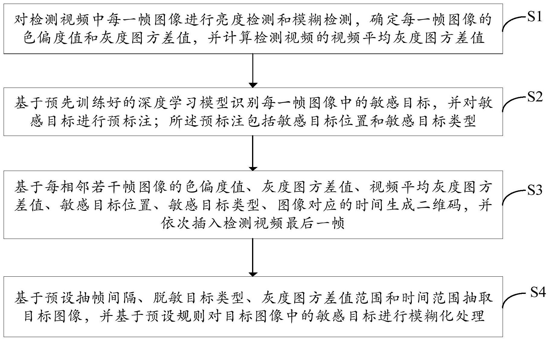 本发明实施例提供一种基于深度学习的视频抽帧方法和系统,通过人工和深度学习模型的辅助,对按设定的时间间隔对相应帧数图像进行模糊、过曝、敏感信息、目标识别,将识别的相应帧数信息存储每16帧生成一个4×4的多二维码画面插入视频最后帧中,可以减少审核人员筛选图片的时间提前过滤掉模糊和过曝帧数,同时每帧信息存储在视频末尾中,方便二次进行筛选,且不遮挡原先每帧的画面,且传统算法中图像模糊阈值较难确定,本系统为视频中的画面检测,在进行检测时,可将全视频帧数的平均值作为阈值参考,且判断时可人为设置参考前后设定时间的视频进行阈值调整来判断图片是否模糊。