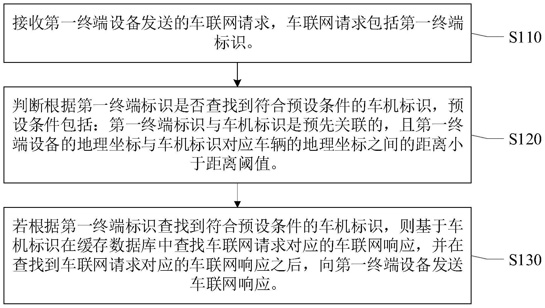 本申请提供一种车联网请求处理方法、装置、电子设备及存储介质,用于改善对车联网访问请求进行处理的效率较低的问题。该方法包括:接收第一终端设备发送的车联网请求,车联网请求包括第一终端标识;判断根据第一终端标识是否查找到符合预设条件的车机标识,预设条件包括:第一终端标识与车机标识是预先关联的,且第一终端设备的地理坐标与车机标识对应车辆的地理坐标之间的距离小于距离阈值;若是,则基于车机标识在缓存数据库中查找车联网请求对应的车联网响应,并在查找到车联网请求对应的车联网响应之后,向第一终端设备发送车联网响应。