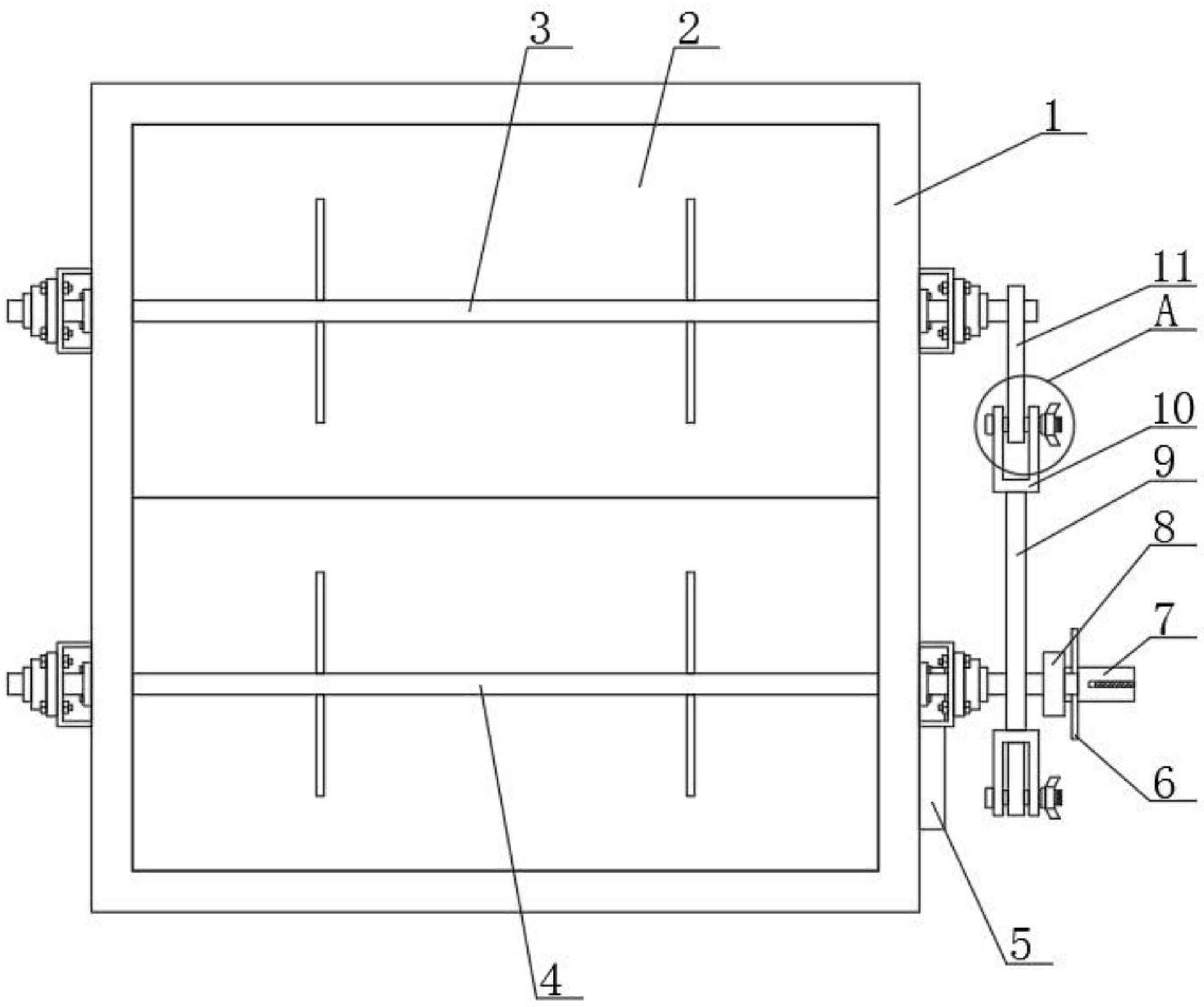 本实用新型公开了一种双挡板加热取暖装置用挡板调节机构,包括进出气管道以及设置在进出气管道内部的第一转轴和第二转轴,且所述第一转轴和第二转轴的表面均焊接有挡板,两个所述挡板处于进出气管道内部,所述第一转轴和第二转轴的两端均贯穿至进出气管道的外侧,且第一转轴和第二转轴的两端均设置有轴承座;通过设置的限位杆、弧形限位座、插槽、弹簧室、等腰梯形卡块、等腰梯形卡孔、侧拉条和条形滑道,使得旋转握杆和旋转座旋转调节后可以通过限位杆得到良好的限位,并使得进出气管道内部的两个挡板也得到良好的限位,从而避免进出气管道内部的两个挡板再次出现旋转的问题,使得整个挡板调节机构可以更加的稳定。