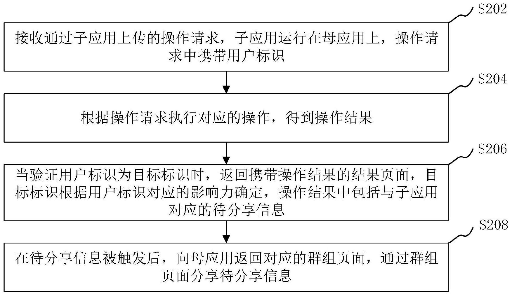 本申请涉及一种信息分享方法和装置,所述方法包括:接收通过子应用上传的操作请求,所述子应用运行在母应用上,所述操作请求中携带用户标识;根据所述操作请求执行对应的操作,得到操作结果;当验证所述用户标识为目标标识时,返回携带所述操作结果的结果页面,所述目标标识根据所述用户标识对应的影响力确定,所述操作结果中包括与所述子应用对应的待分享信息;在所述待分享信息被触发后,向所述母应用返回对应的群组页面,通过所述群组页面分享所述待分享信息。本申请提供的方案可以提高待分享信息的分享成功率,减少交互次数,有效的节省交互资源。