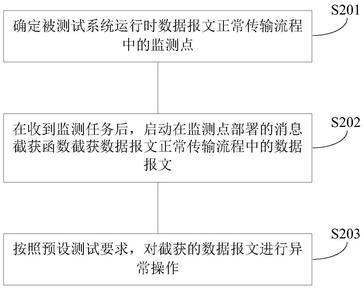 本发明属于计算机网络领域,公开了一种测试数据报文异常的方法、装置和计算机可读存储介质,以解决现有的测试数据报文异常的方法通用性欠佳和效率低下的问题。所述方法包括:确定被测试系统运行时数据报文正常传输流程中的监测点;在收到监测任务后,启动在监测点部署的消息截获函数截获数据报文正常传输流程中的数据报文;按照预设测试要求,对截获的数据报文进行异常操作。本发明提供的技术方案一方面在于技术方案的通用性较强,适合各种系统的测试;另一方面,不会影响其他用户对待测系统进行的测试,其他用户可以共享待测系统的代码,因而对待测系统的测试效率高。
