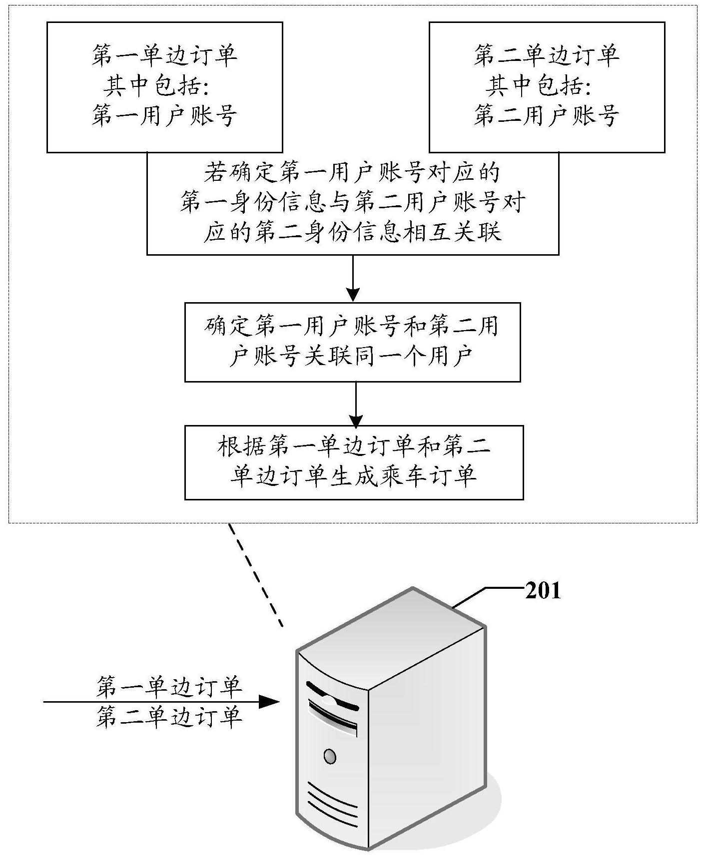 本申请实施例公开了一种乘车订单生成方法和装置,针对来自第一支付渠道和第二支付渠道的单边订单,可以根据单边订单中的第一用户账号和第二用户账号分别对应的身份信息来判断是否具有相互关联的,若对应第一单边订单和第二单边订单,其中第一用户账号对应的第一身份信息与第二用户账号对应的第二身份信息相互关联,可以确定第一用户账号和第二用户账号关联同一个用户,第一单边订单和第二单边订单为该用户在一次行程中通过不同的支付渠道生成的单边订单。从而可以根据第一单边订单和第二单边订单生成乘车订单,便于对该用户的行程费用进行准确确定。