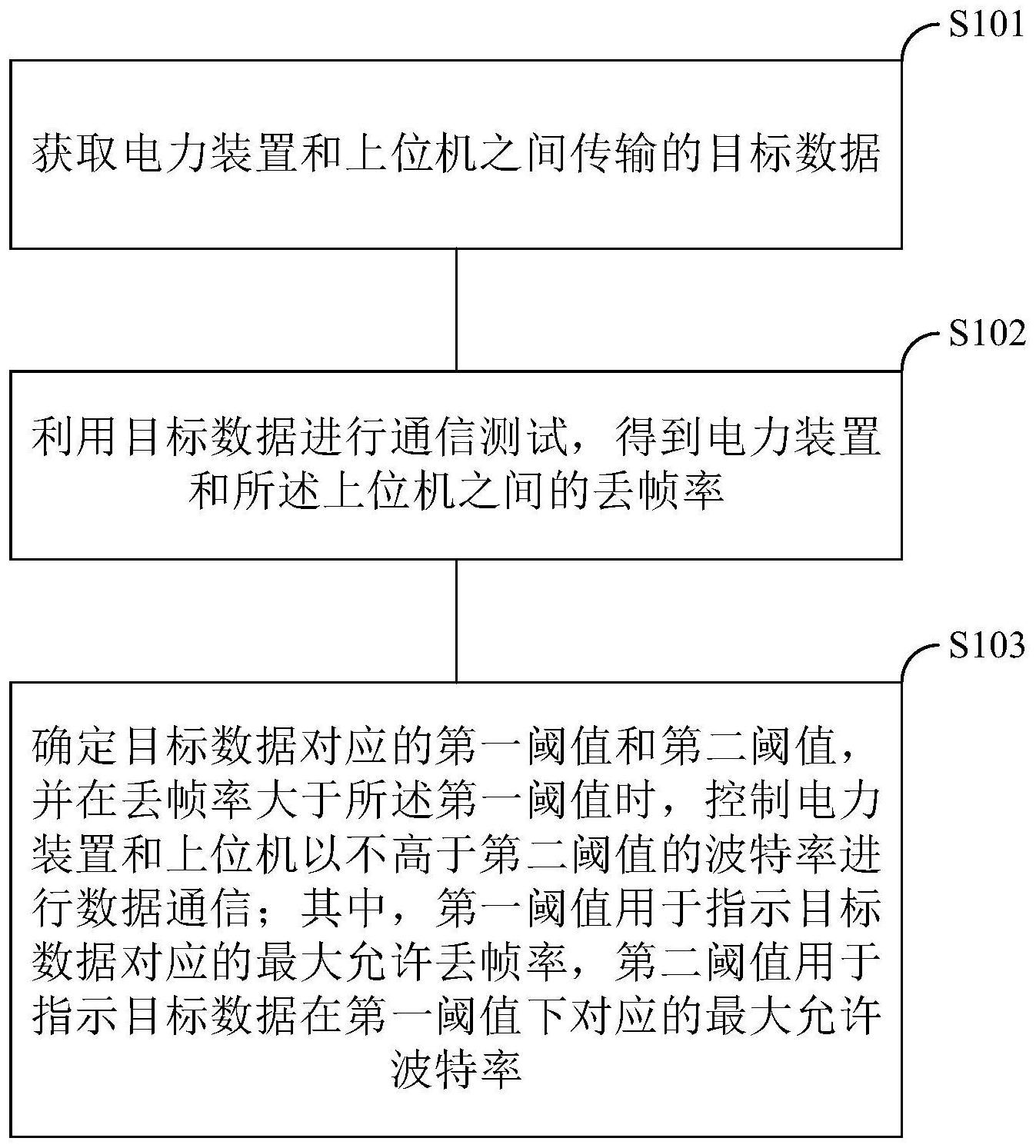 本发明提供一种电力装置的通信方法、电力装置及存储介质。该方法包括:获取电力装置和上位机之间传输的目标数据;利用目标数据进行通信测试,得到电力装置和上位机之间的丢帧率;确定目标数据对应的第一阈值和第二阈值,并在丢帧率大于第一阈值时,控制电力装置和上位机以不高于第二阈值的波特率进行数据通信;其中,第一阈值用于指示目标数据对应的最大允许丢帧率,第二阈值用于指示目标数据在第一阈值下对应的最大允许波特率。本发明能够提高电力装置与上位机的数据传输可靠性。