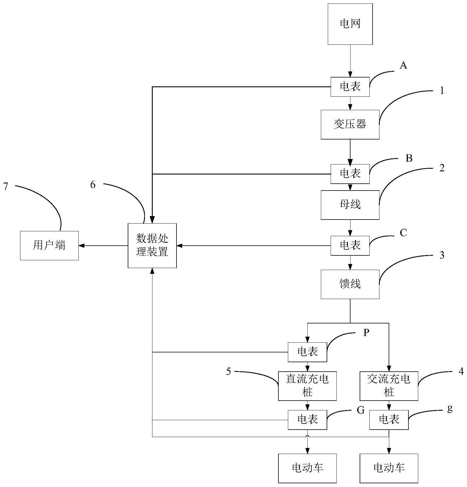 一种充电场站电能损耗计量系统和计量方法,本发明涉及一种充电场站电量损耗系统,应用于该系统的计量方法、数据处理装置和数据处理方法,通过安装在变压器进线侧、母线进线侧、馈线进线侧、直流充电桩进线侧、直流枪输出侧和交流枪输出侧的电表采集电表电能数据,直流充电桩和交流充电桩采集订单时间和订单电能数据,订单时间、订单电能数据和电表电能数据网络传输到数据处理装置,数据处理装置计算出变压器损耗、母线损耗、每路馈线损耗、每个直流充电桩转换损耗和每个枪的计量损耗,并将损耗明细以日报、周报和月报的形式传输给用户端,明确了整个充电站从变压器、母线、每路馈线馈线、每个充电桩、到每把充电枪的用电损耗情况,让运营者及时掌握将整个充电场站电量损耗情况。