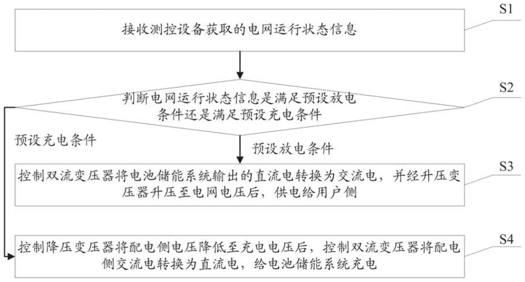 本发明公开了一种用户侧储能系统的能量管控方法、装置、存储介质及系统,其中,该方法包括:接收测控设备获取的电网运行状态信息;判断电网运行状态信息是满足预设放电条件还是满足预设充电条件;若满足预设放电条件,则控制双流变压器将电池储能系统输出的直流电转换为交流电,并经升压变压器升压至电网电压后,供电给用户侧;若满足预设充电条件,则控制降压变压器将配电侧电压降低至充电电压后,控制双流变压器将配电侧交流电转换为直流电,给电池储能系统充电。本发明满足预设放电条件时,供电给用户侧,提升了供电可靠性和用户稳定性能,以及满足预设充电条件时,给电池储能系统充电,提升了系统功率因素和电能质量,以及降低了线损。