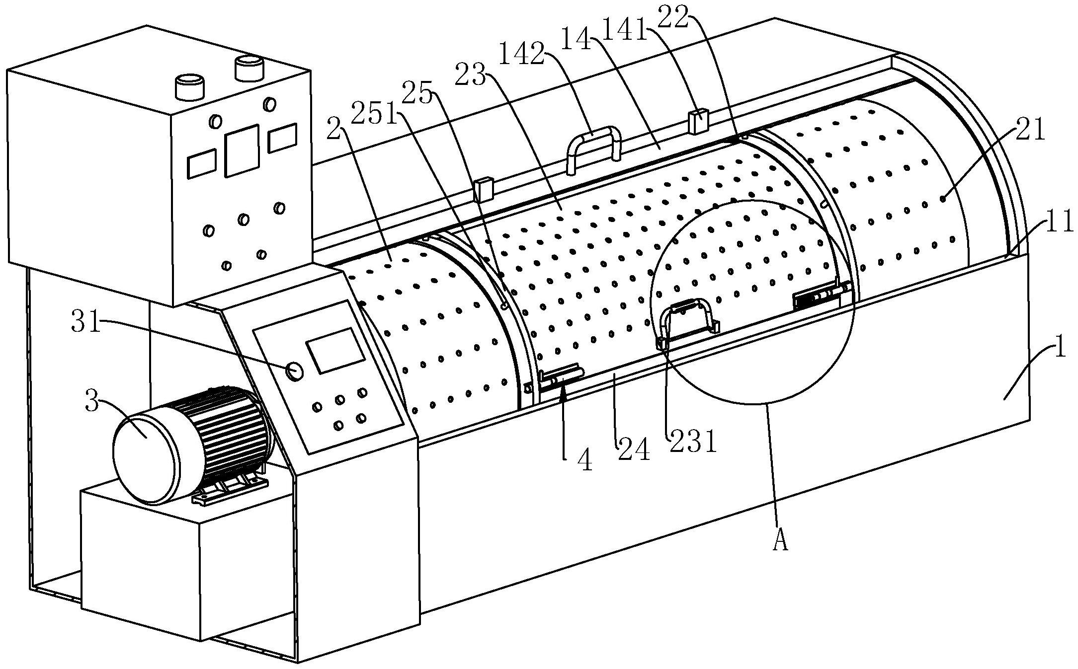 本实用新型涉及一种大容量滚筒甩干机,包括壳体、转动连接在所述壳体内部的甩筒,所述壳体内部固接有驱动所述甩筒旋转的电机,所述电机输出轴与所述甩筒一端固接,所述甩筒外圆周面上开设有供水流出的滤水孔,所述甩筒上开设有放置口,所述甩筒开设所述放置口的两侧开设有第一滑槽,所述滑槽中滑动连接有第一挡板,所述壳体上开设有开口,所述壳体上连通有排水管。本实用新型具有可以满足大批量衣服甩干的需要,大大提高了工作效率的效果。