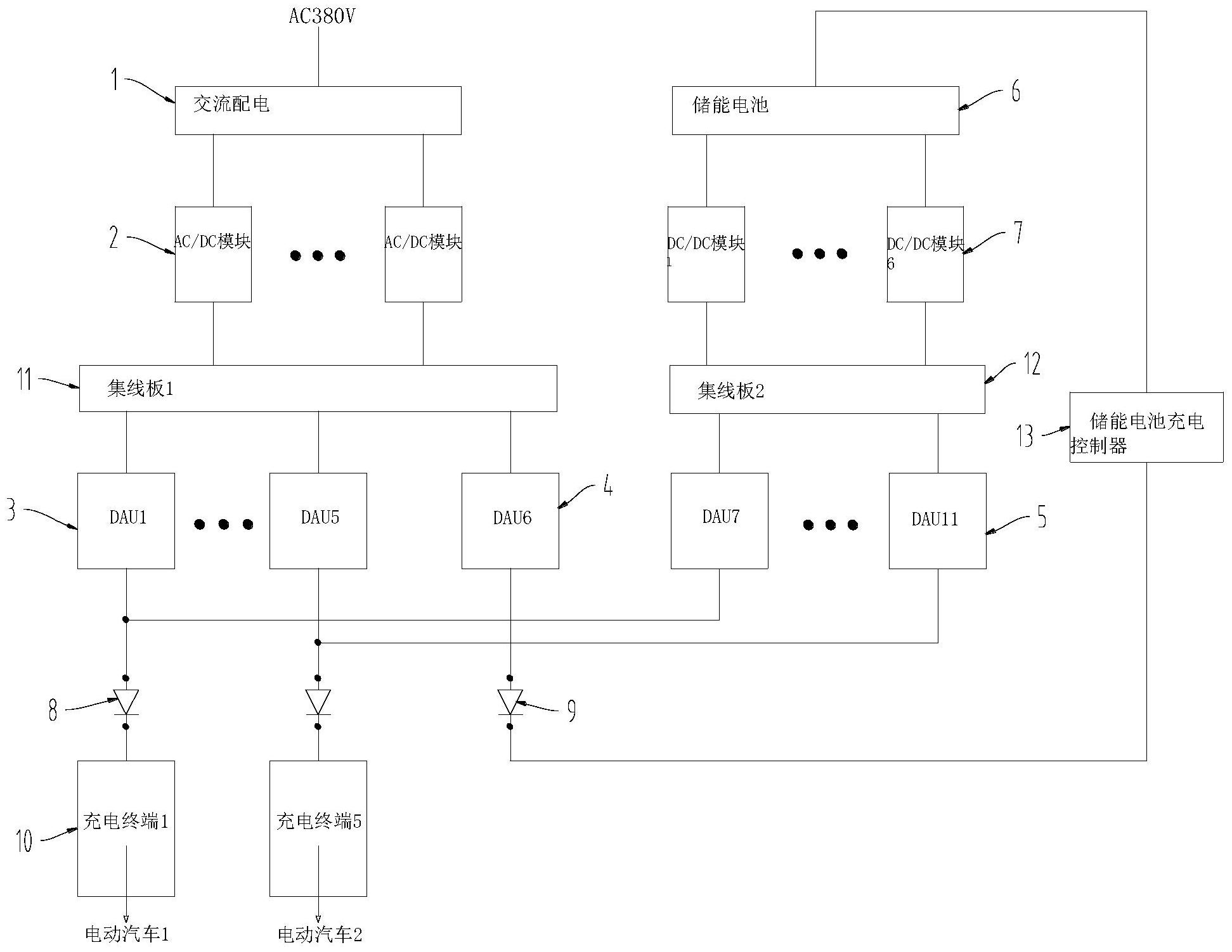 本实用新型涉及电动汽车充电技术领域,公开了一种能削峰填谷的电动汽车充电系统,包括交流配电设备、多个AC/DC模块、多个第一DAU、至少一个第二DAU、储能电池、多个DC/DC模块、与所述DC/DC模块一一相连的多个第三DAU、充电终端、储能电池充电控制器、功率分配控制器。本实用新型具有以下优点和效果:在负荷低谷时市电向储能电池充电,在负荷高峰时,优先使用储能电池作为充电电源给电动汽车充电,储能电池功率不足时再调配市电作为充电电源给电动汽车充电。调配自由灵活,充电系统的峰谷模式也可以平滑转换,可以根据不同时段的充电需求动态调整储能电池、电动汽车的充电功率,提高储能电池利用率,实现电动汽车充电系统的削峰填谷功能。