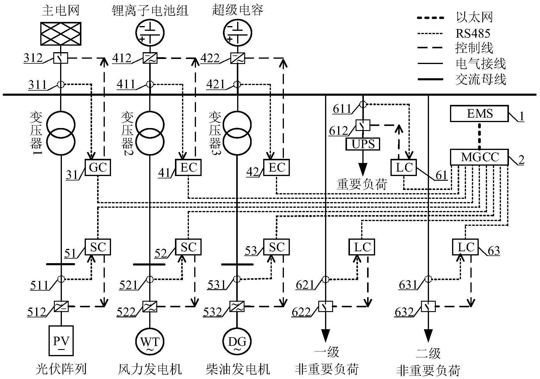 本实用新型微电网领域,特别涉及一种微电网分层协调控制装置。本实用新型的分层协调控制装置包括集中控制层和就地控制层,集中控制层包括能量管理系统和微电网中央控制器,就地控制层包括本地控制器和本地受控装置,本地控制器包括并网控制器、能量控制器、电源控制器和负荷控制器,本地受控装置包括混合储能系统、混合发电系统、并网开关、第一交流接触器、第二交流接触器、第三交流接触器和多级可控可投切负荷。能量管理系统与微电网中央控制器通过以太网通信连接,微电网中央控制器作为中心节点和本地控制器通过RS485星型拓扑通信结构连接。本实用新型的分层控制装置能对微电网进行集中式协调控制,提高微电网运行稳定性,提高能量存储系统和可再生能源经济利用率。