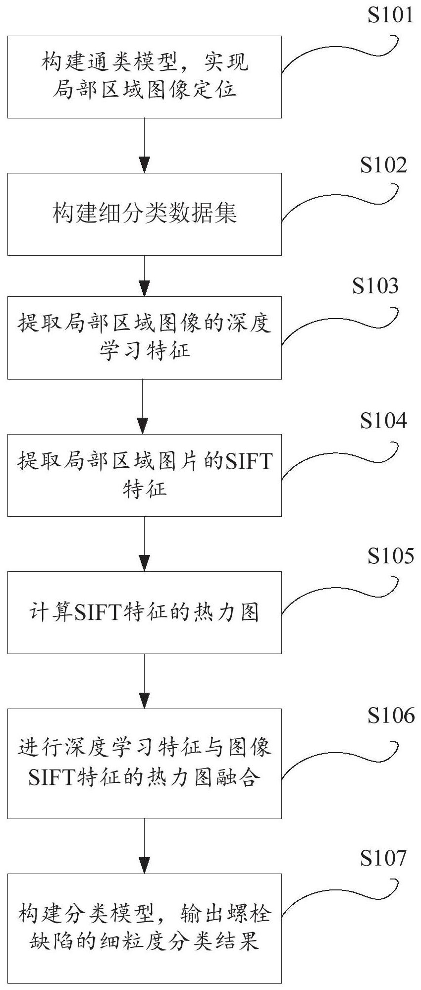 本发明公开了一种输电线路细粒度螺栓缺陷诊断方法及系统,包括:对于获取到的待识别图像,对设定目标所在的区域进行定位,得到所述目标所在区域的局部区域图像;提取局部区域图像的深度学习特征;提取局部区域图片的SIFT特征,并计算各特征的热力图;将深度学习特征与SIFT特征的热力图进行融合;根据融合后的特征实现对待识别设备缺陷的细粒度分类。本发明有益效果:可实现更全面的局部细节信息提取,从而有效提升了细粒度图像识别方法的识别准确率。在一定程度上解决了传统的图像分类网络中,无论图像中的重要判别区域占整个图像的比重有多大,都只会对整张图片一视同仁提取特征的问题。
