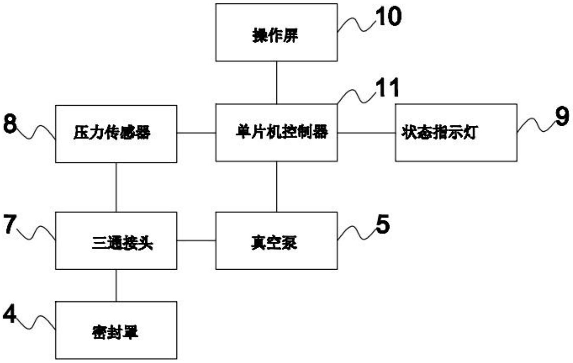 本实用新型公开了一种钓鱼箱排水口密封性监测装置,包括设置在钓鱼箱上的排水口,排水口出水端上连接有一封板,还包括密封罩、抽真空泵和测试控制箱,密封罩用于罩盖密封连接位于钓鱼箱内的排水口进入端,密封罩的进气口与三通接头之间通过管路连接,三通接头的一端与抽真空泵连接,该三通接头的另一端连接有一压力传感器,测试控制箱上设置有状态指示灯、操作屏和单片机控制器,单片机控制器分别与状态指示灯、操作屏、压力传感器和抽真空泵电性连接。