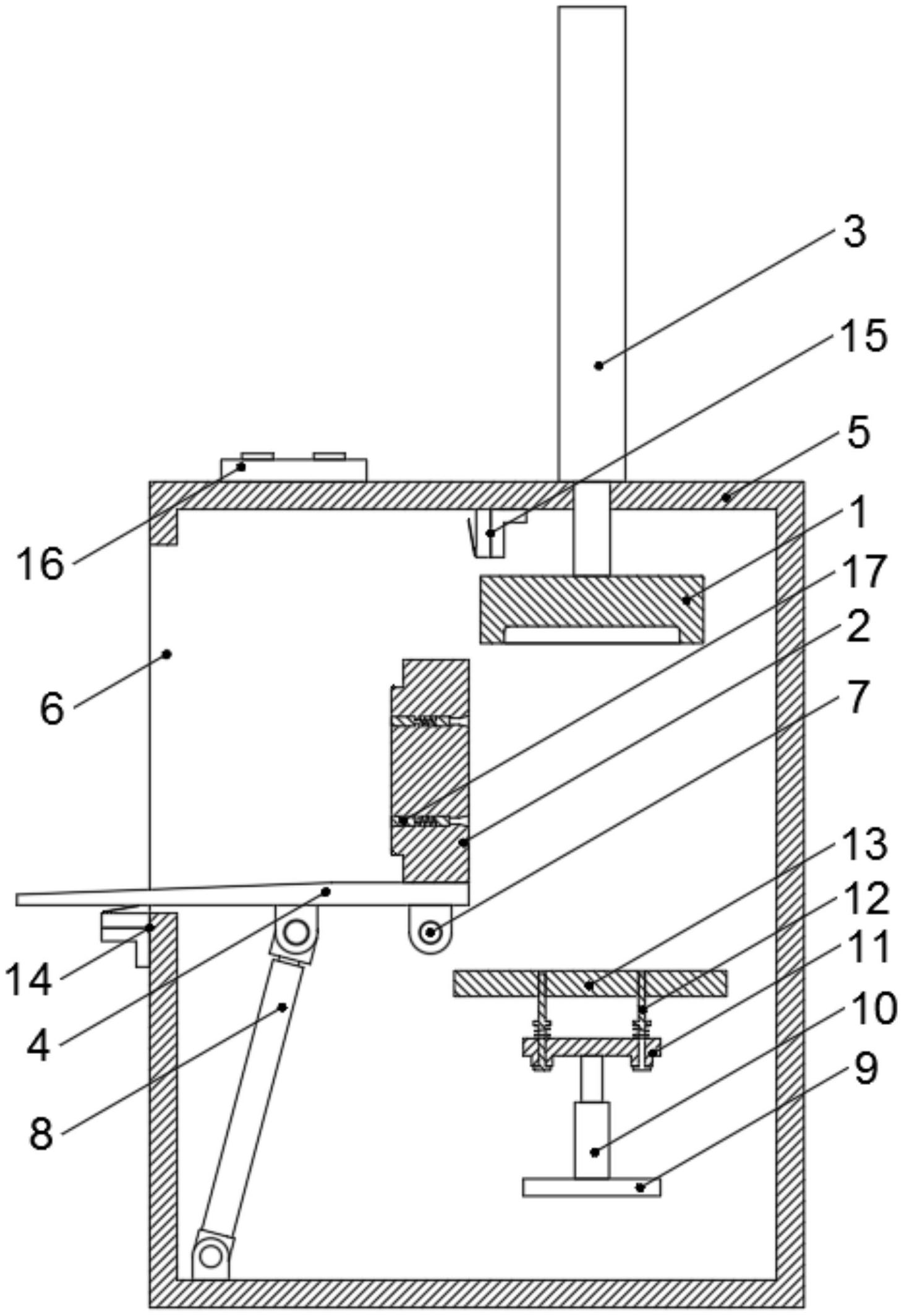 本实用新型属于保温箱模具技术领域,具体涉及保温箱专用模具,包括上模体和下模体,上模体安装在千斤顶底部,下模体安装在安装板上且下模体内侧滑动安装有顶杆,千斤顶安装在外壳体顶面,安装板通过转动座转动安装在外壳体内侧,外壳体侧面开设有取料口,安装板转动连接液压杆一,外壳体内侧安装的固定座上安装有液压杆二,液压杆二顶端连接连接座底面,连接座上滑动安装有顶杆,顶杆的上侧滑动插接在定位座中,外壳体的外侧面固定安装有行程开关一,外壳体的内顶面固定安装有行程开关二,通过可翻转并进行精确定位的下模体的设计,在压塑及取料过程中,避免操作人员肢体进入上模体与下模体之间进行危险动作,保证了操作者的作业安全。