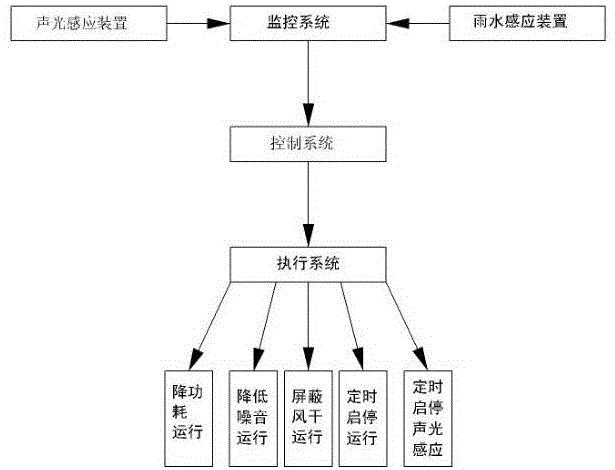 无人值守洗车机自适应系统,包括监控系统、控制系统和执行系统,所述监控系统包括声光感应装置和雨水感应装置,所述声光感应装置设置在洗车机/或洗车机周围的建筑物上,所述雨水感应装置设于洗车机顶部中,所述声光感应装置用于感应噪音和检测光线亮度,所述雨水感应装置用于监控洗车机周边天气的状况并反馈;所述控制系统用于接收和储存所述监控系统所反馈的监测数据,并根据所述监测数据发出控制指令至执行系统,控制执行系统工作;所述执行系统包括定时启停声光系统、定时启停运行、屏蔽风干运行、降低噪音运行和降功耗运行。