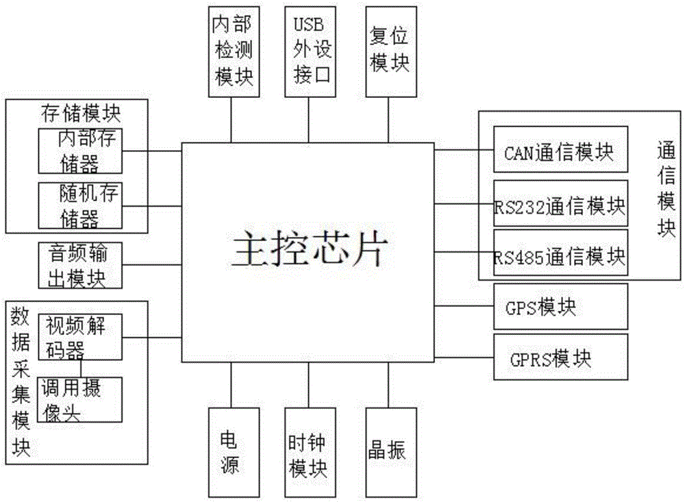 本实用新型公开了一种及时性疲劳提醒装置,包括主控芯片;主控芯片连接存储模块、数据采集模块、音频输出模块、通信模块、GPS模块、GPRS模块;存储模块包括内部存储器、随机存储器;数据采集模块包括调用摄像头、视频解码器;调用摄像头采集司机的面部表情,并将数据传递给视频解码器,视频解码器讲数据传递给主控芯片;通信模块包括CAN通信模块、RS232通信模块、RS485通信模块。本装置通过图像识别的方法,实时地对驾驶员的一些精神状态进行分析,对危险驾驶的行为及时报警提醒。主要应用于汽车安全驾驶领域。
