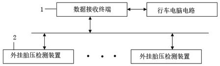 本发明涉及一种外挂式胎压监测系统及其方法,系统包括数据接收终端、外挂胎压检测装置,每个车轮的气门均与一个外挂胎压检测装置连接,且外挂胎压检测装置包覆在气门外,各外挂胎压检测装置间相互并联,并与数据接收终端间通过无线通讯建立数据连接,数据接收终端与车辆行车电脑电路电气连接。其监测方法包括设备装配,胎压检测运行及检测维护等三个步骤。本发明可有效满足多种车辆胎压同步检测作业的需要,极大的提高了本发明的使用灵活性和通用性;本发明胎压数据检测精度高、数据获取通讯信号质量稳定性好,且检测数据获取便捷,从而极大的提高了车辆胎压检测可靠性和稳定性。