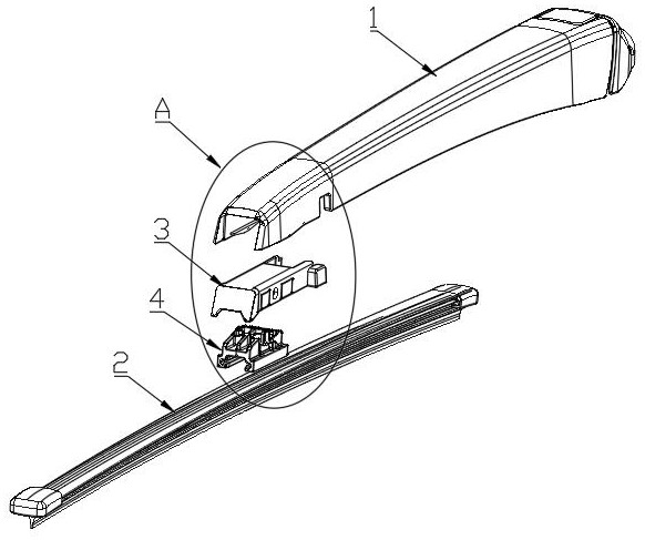 本申请提供一种后雨刮器,包括刮臂、刮片、卡扣及连接头。刮臂的前端底面沿长度方向开设有连接槽,卡扣后段插设于连接槽内;卡扣截面呈倒置的U型结构,其底部具有U型槽,连接头的顶部转动设于U型槽内,其转动的轴线垂直于刮臂的长度方向;连接头的底面具有安装槽用于穿设刮片,安装槽的延伸方向与连接槽的延伸方向一致。各零件之间的结构更加稳定,可减小雨刮器运行的晃动,增加平稳性。