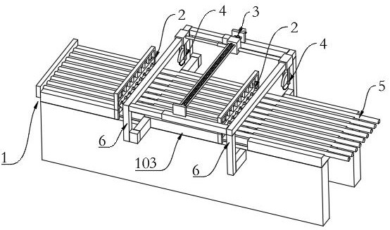 本申请提供一种管件切割装置,包括:第一支架,包括一对支撑板、3个容置板,3个容置板间隔设于一对支撑板上方,容置板上方均沿支撑板长度方向开设有多个第一弧形槽,用于容置管件,位于支撑板顶部的一端的一个容置板朝外的一端设有1个挡板,用于阻挡管件端部;2个压紧机构,分别设于相邻的容置板之间,用于压紧管件;直线机构,设置于位于中部的一个容置板的上方,其活动端移动方向为支撑板厚度方向;2个切割机,分别设于相邻的容置板间隙处的外侧,且通过连接部件连接于直线机构活动端的两侧。可将多个多跟管件的两段进行同时切割,有效提高切割效率。