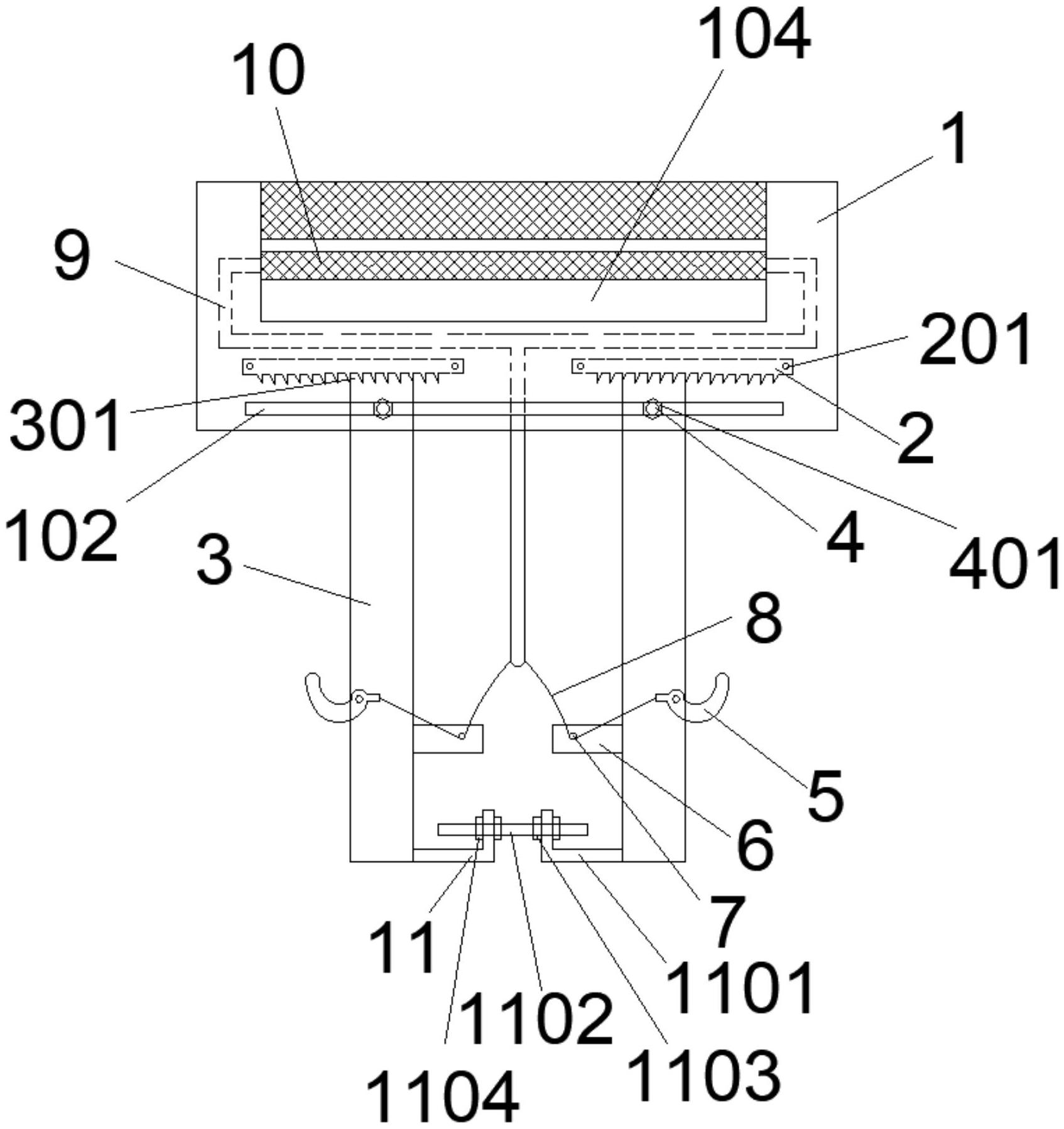 本实用新型公开了一种用于矿井支护金属网编制的装置,包括呈方环形结构设置的握把,所述握把内部为中空结构,所述握把下部形成有开口滑槽,所述握把内形成有与开口滑槽对应的两个锯齿卡位条,所述开口滑槽下部对应设置有两个用于调节金属网网孔宽度的网孔调节板,所述网孔调节板上部形成有与锯齿卡位条对应的锯齿结构,所述握把侧面设置有与所述网孔调节板对应的长条形滑槽二,所述网孔调节板、握把通过螺纹柱一固定,所述网孔调节板的外侧面铰接设置有挂钩,本实用新型结构简单,能够在金属网编制时对网孔大小进行检查和调整,从而更好的提高金属网的支护性能。