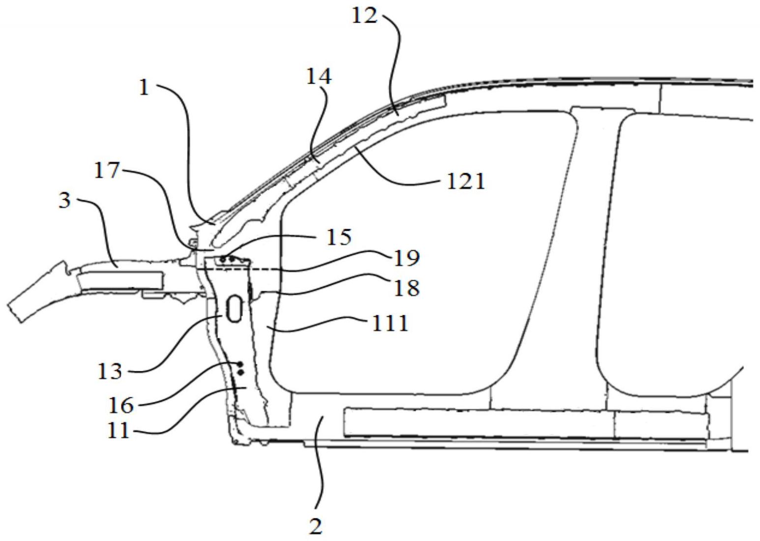 一种用于车辆的车身结构,所述车身结构包括A柱和门槛,所述A柱包括竖向前柱和自所述竖向前柱的上端朝向后上方延伸的前上柱,所述门槛连接于所述竖向前柱的下端并且沿水平方向延伸。其中,所述A柱还包括设于所述竖向前柱内的延伸方向与所述竖向前柱一致的第一补强板和设于所述前上柱内的延伸方向与所述前上柱一致的第二补强板;所述第一补强板覆盖所述A柱上的前门铰链安装部、以及所述竖向前柱与所述门槛的接合部位;所述第二补强板的下端与所述第一补强板的上端之间存在非结合区域。所述车身结构既能够保证其A柱具有足够的强度,又可以维持车身前后刚性的平衡。
