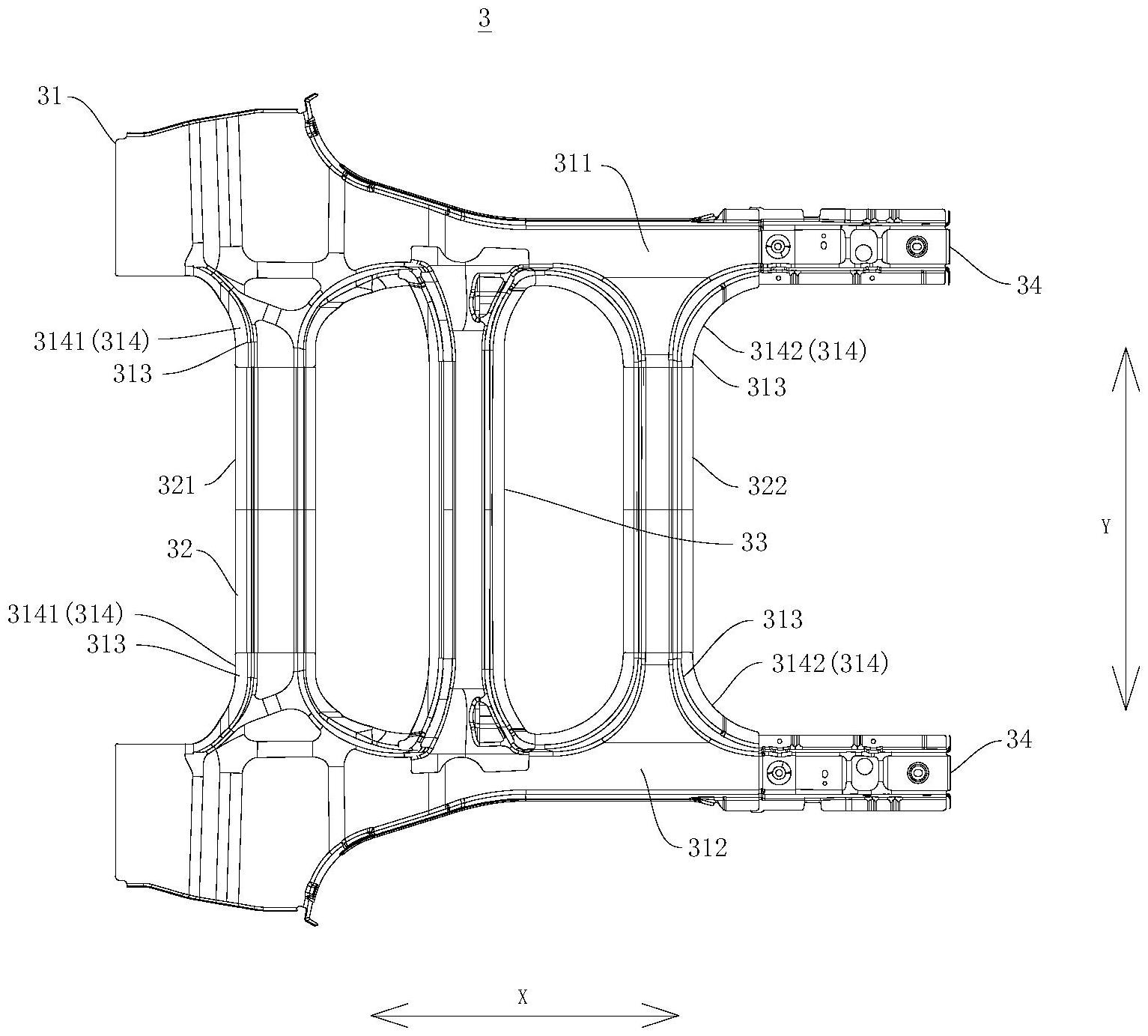 本实用新型公开了一种车辆的后地板框架以及车辆,车辆的后地板框架包括:纵梁结构,纵梁结构包括沿后地板框架的第一方向间隔且相对设置的第一纵梁和第二纵梁,第一纵梁和/或第二纵梁具有朝向彼此延伸的延伸梁;横梁结构,横梁结构连接在第一纵梁和第二纵梁间,且横梁结构与相应的延伸梁连接。由此,通过使第一纵梁和/或第二纵梁具有朝向彼此延伸的延伸梁,并使横梁结构与相应的延伸梁连接,与现有技术相比,能够提高后地板框架结构强度以及耐久性,从而使后地板框架能够满足车身的结构强度要求,能够提高车辆的安全性,并且,这种结构形式的后地板框架的NVH性能良好,能够提升用户的驾驶体验。