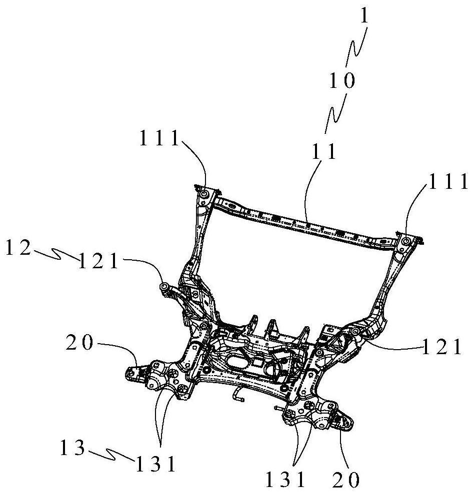 本实用新型公开了一种副车架总成和车辆,副车架总成包括副车架本体和加强支架,其中,副车架本体具有多个用于与车身连接的第一连接部;加强支架固定设置在副车架本体上,加强支架具有用于与车身连接的第二连接部。根据本实用新型的副车架总成,能够实现车辆碰撞时车身底板与脚坑地板之间焊点不易撕裂的技术效果。