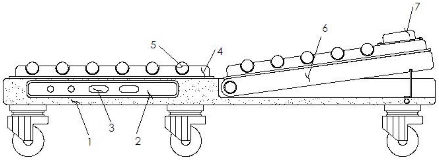 本实用新型公开了一种便于拿取工具的汽修用躺板,可以避免人体对地面直接接触,方便工作人员对位置的调节,主要由躺板本体和调节板组成;调节板,活动轴连接在所述躺板本体的上方右侧;包括:移动箱,卡合在所述躺板本体的前后两侧,所述移动箱的外侧卡合有对汽车进行检修的工具本体;升降板,卡合在所述躺板本体的上方;按摩球,均匀分布在所述升降板和调节板的上方;海绵枕头,固定在所述调节板的上方右侧。该便于拿取工具的汽修用躺板,安装有螺纹杆和支撑杆,通过螺纹杆的转动带动支撑杆在移动的同时进行转动,进而推动调节板上下转动,根据不同的位置进行调节,适用于不同的工作人员,方便对底盘内部的零件进行检修。