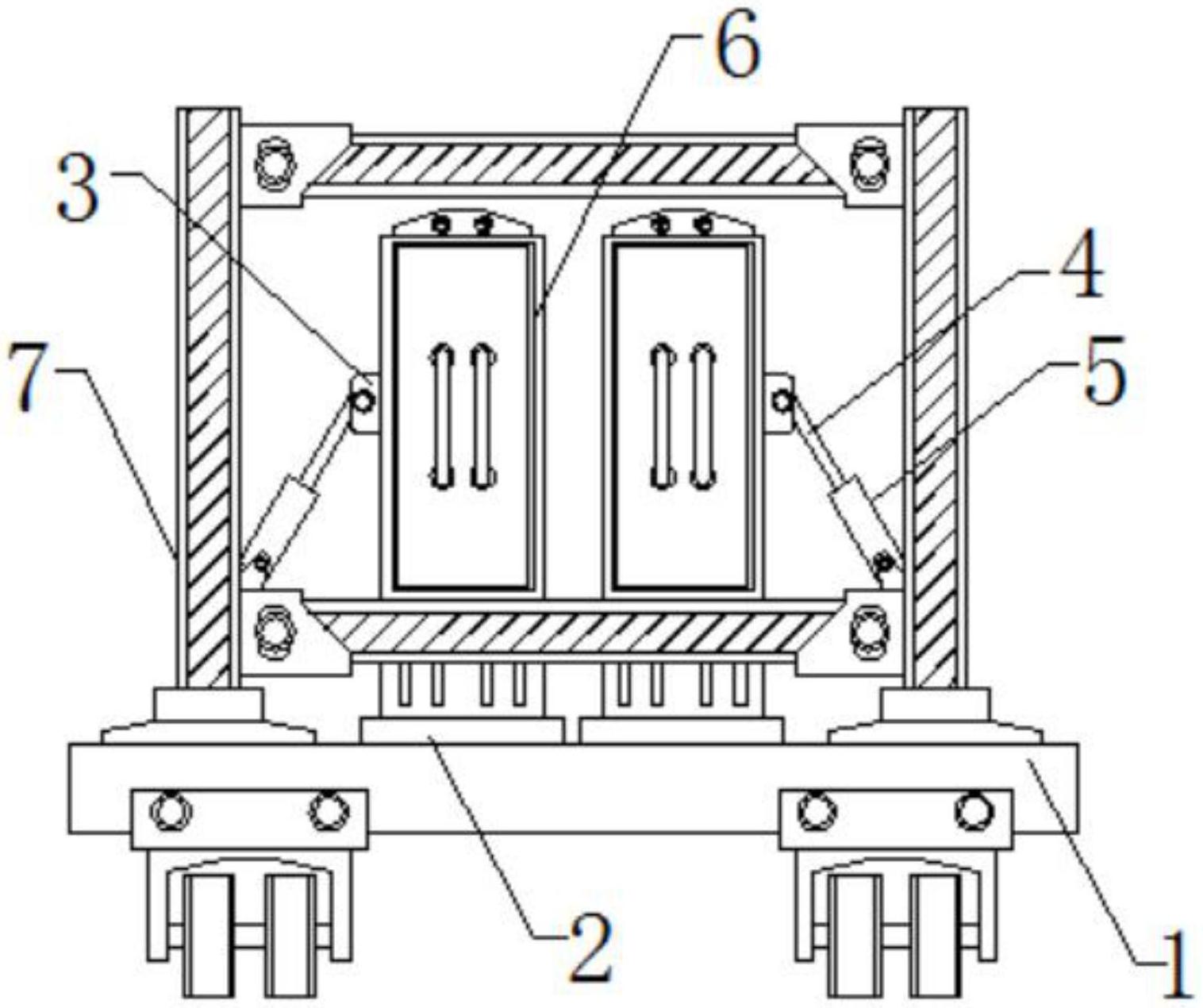 本实用新型公开了一种新能源汽车电池转运用减震定位装置,装置基座,其正上方开设有箱体凹槽,所述夹持力臂的底部螺纹连接有双向丝杆,铰接座,其一侧轴贯穿连接有a减震支杆,且a减震支杆的底部嵌套连接有b减震支杆,包括:储存箱体,其安装在箱体凹槽的内部,且箱体凹槽内部设置有夹持力臂,所述夹持力臂的外侧嵌套连接有磁吸力柱,且磁吸力柱的外侧螺纹连接有电磁铁块;横梁支架,其焊接固定在装置基座的顶部。该新能源汽车电池转运用减震定位装置;采用夹持力臂及导向滑杆,利用双向丝杆对夹持力臂进行螺纹连接,根据装置的尺寸对两组夹持力臂之间的距离进行调节,利用夹持力臂对储存箱体的左右两侧进行夹持固定。