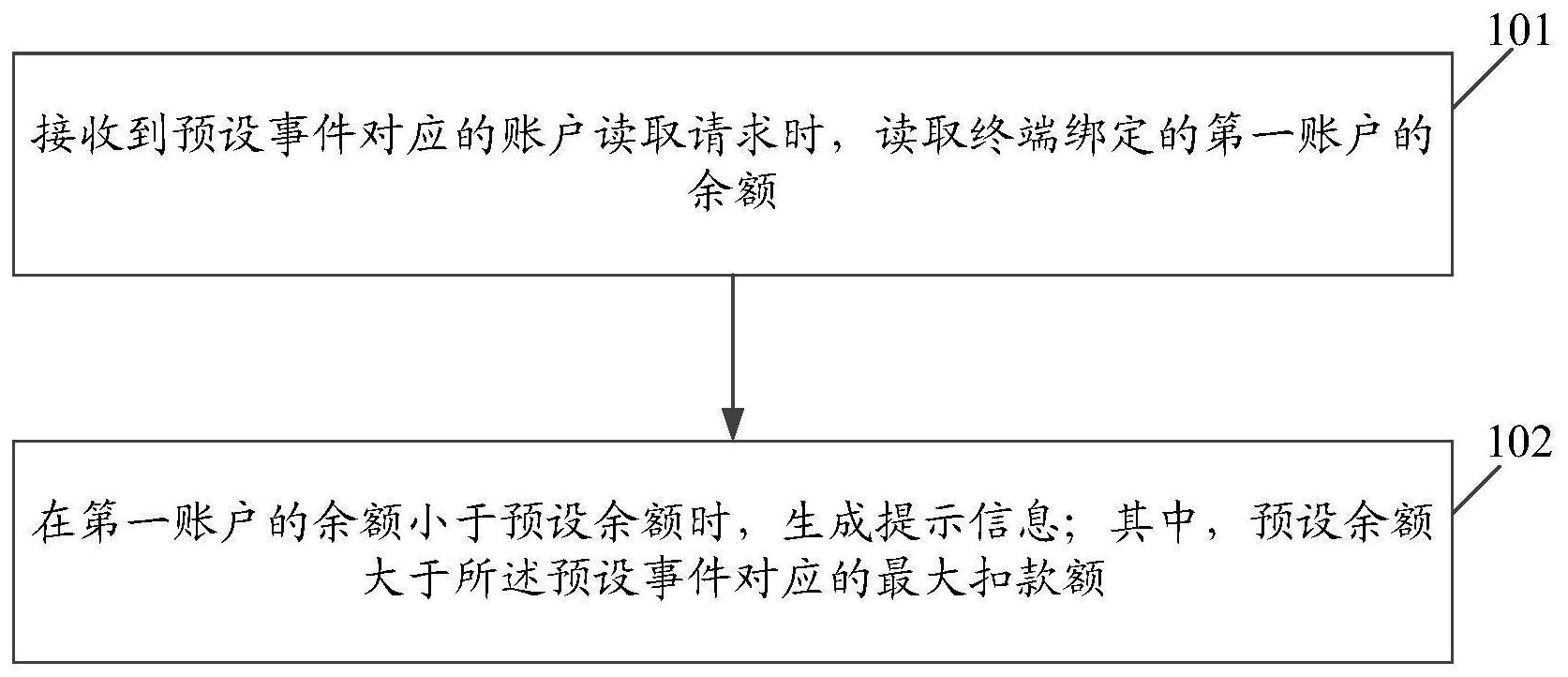 本发明实施例提出了一种数据处理方法、终端、电子设备和计算机存储介质,该方法包括:接收到预设事件对应的账户读取请求时,读取所述终端绑定的第一账户的余额;在所述第一账户的余额小于预设余额时,生成提示信息;其中,所述预设余额大于所述预设事件对应的最大扣款额。可以看出,由于预设余额大于预设事件对应的最大扣款额,因而,可以通过提示信息提示用户预先对第一账户进行补款,在一定程度上可以及时地实现第一账户的补款;当预设事件为公交出行等通行事件时,与相关技术的技术方案相比,可以提升用户的通行效率。