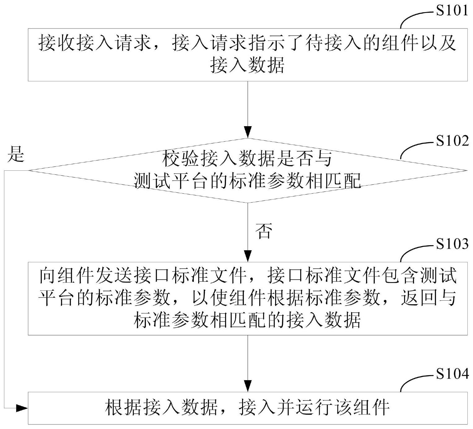 本发明公开了一种接入测试平台的方法和装置,涉及计算机技术领域。该方法的一具体实施方式包括:接收接入请求,接入请求指示了待接入的组件以及接入数据;校验接入数据是否与测试平台的标准参数相匹配;如果是,根据接入数据,接入并运行组件;如果否,向组件发送接口标准文件,接口标准文件包含测试平台的标准参数,以使组件根据标准参数,返回与标准参数相匹配的接入数据;并根据接入数据,接入并运行组件。该实施方式使得组件接口与测试平台的接口相匹配,保证组件能够顺利接入测试平台,提高了测试的效率。