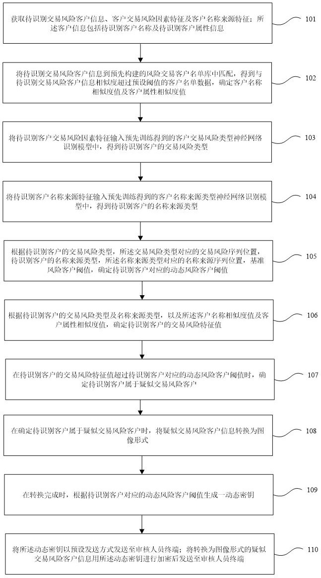 本发明公开了一种交易风险名单数据的动态识别处理方法及装置,涉及大数据领域,该方法包括:将待识别交易风险客户信息到风险交易客户名单库中匹配得到相似客户数据及名称、属性相似度值;将风险因素特征输入交易风险类型识别模型得到交易风险类型;将名称来源特征输入名称来源类型识别模型得到客户名称来源类型;根据交易风险类型、名称来源类型及对应序列位置确定动态风险阈值;根据风险及来源类型,名称、属性相似度值,确定风险特征值;在特征值超过动态风险阈值时确定待识别客户属于风险客户;将风险客户信息转换为图像,根据动态风险阈值生成动态密钥,将密钥及用动态密钥加密的图像发送至审核终端。本发明可以高效准确地进行名单识别处理。