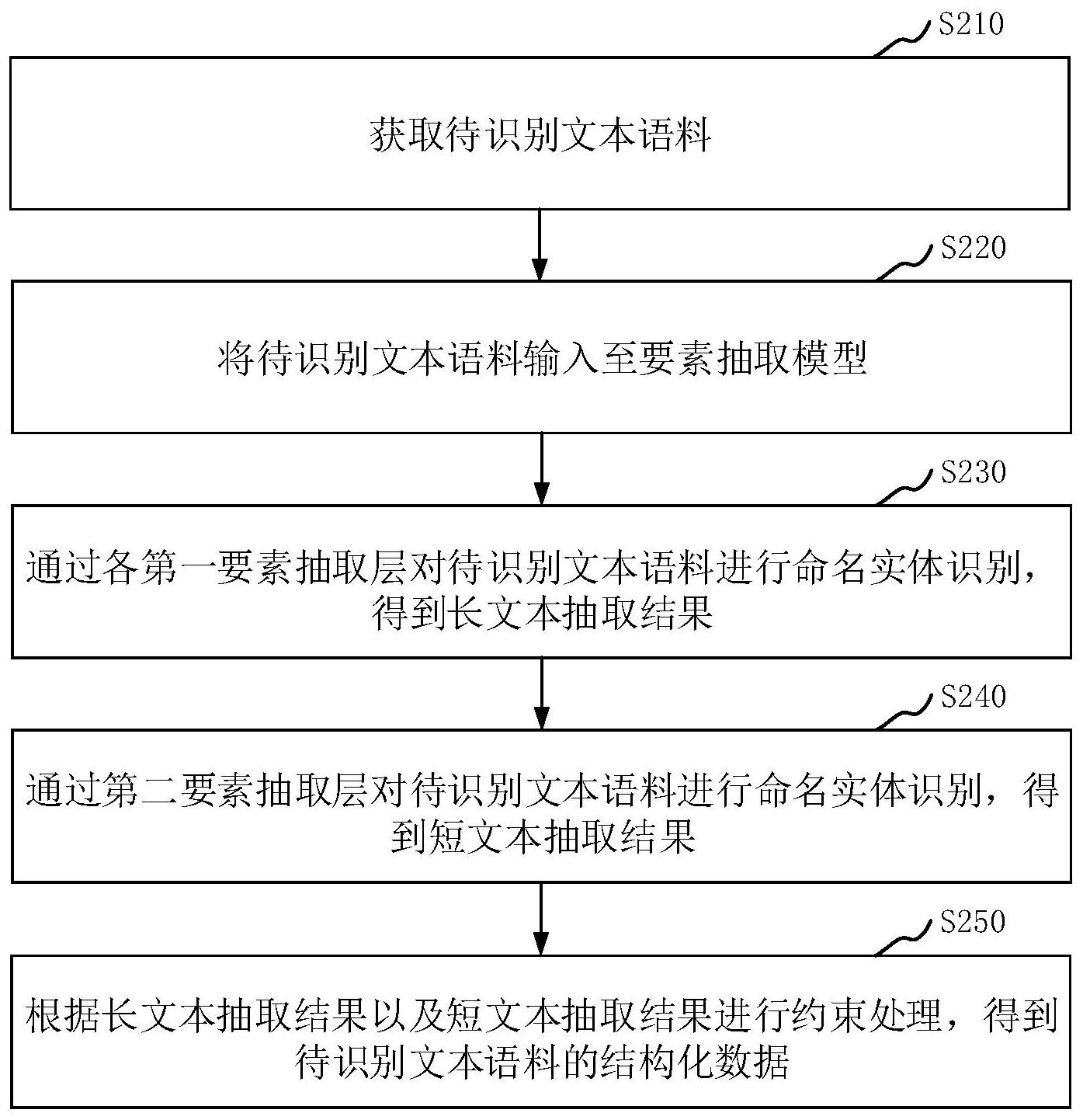 本申请涉及一种要素抽取方法、装置、计算机设备和存储介质,通过获取待识别文本语料,将所述待识别文本语料输入至要素抽取模型,并通过要素抽取模型的长文本要素抽取分支对所述待识别文本语料进行命名实体识别,得到长文本抽取结果,实现了长句的抽取;通过要素抽取模型的短文本要素抽取分支对所述待识别文本语料进行命名实体识别,得到短文本抽取结果,从而根据所述长文本抽取结果以及所述短文本抽取结果进行约束处理,得到所述待识别文本语料的结构化数据,不仅实现所述长文本抽取结果以及所述短文本抽取结果的结合,可以提升要素抽取准确率达97%以上,还可以解决要素重叠的问题。