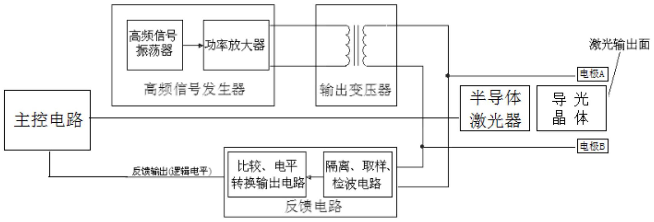 本发明涉及一种用于半导体激光脱毛机的安全防护装置及控制方法,包括主控电路,半导体激光器,高频信号发生器,输出变压器,导光晶体,输出电极以及反馈电路,所述反馈电路与输出电极连接,反馈电路输出信号以逻辑电平表示,反馈电路的输出信号与主控电路连通;所述主控电路分别与半导体激光器、反馈电路连接,高频信号发生器与输出变压器连接,半导体激光器输出的激光经过导光晶体形成工作激光,输出变压器与输出电极连接,输出电极安装在导光晶体两侧,本发明能避免误触发输出激光导致人体特别是人眼受到的不可逆伤害。