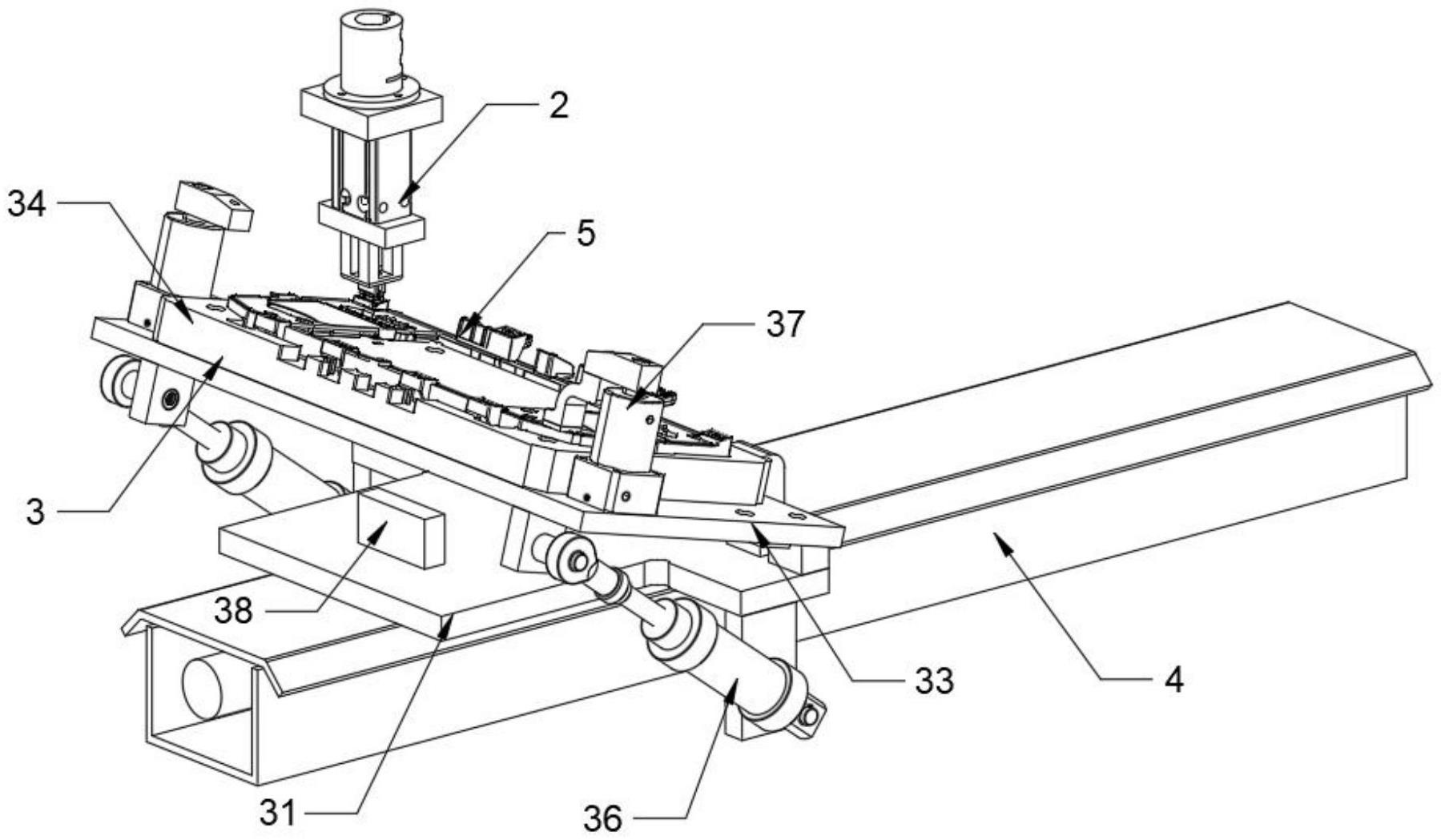 本实用新型涉及装配加工辅助工装技术领域,具体为胀扣式移载辅助组装机构,包括能够连续整理并输送弹性卡扣的卡扣整理设备,还包括卡扣取压部,所述卡扣取压部包括能够从所述卡扣整理设备上取出所述弹性卡扣的取件头,且所述取件头上设有能够通过挤压所述弹性卡扣使其弹性胀大后压装到组装产品本体上的压头;该胀扣式移载辅助组装机构,能够通过设有的卡扣取压部压取所需要组装的弹性卡扣,结构简单,能够配合可翻转调节组装角度的产品定位部相互协同配合,获得更适应于产品组装卡扣的垂直精度;能够提高组装效率,降低时间成本,人力成本,提高产能;同时能够通过卡扣取压部在水平面移动,以保证多点位工序依次压装的准确性与品质。