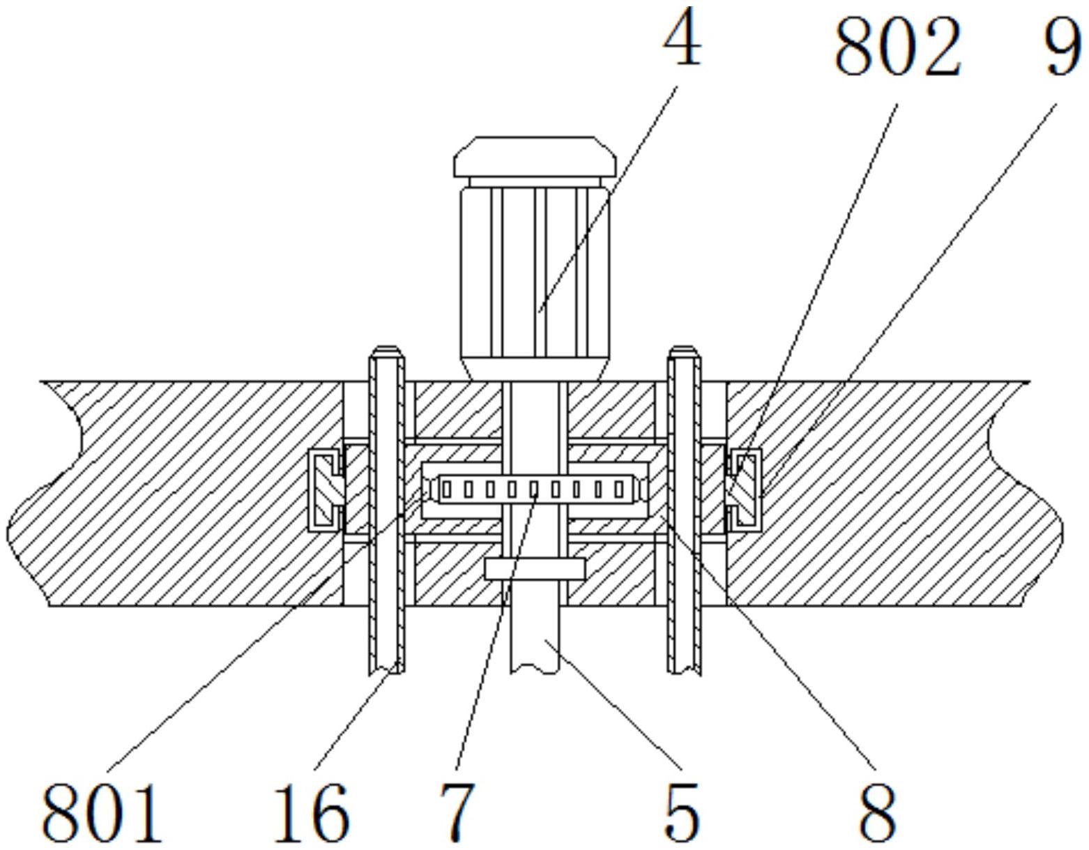 本实用新型公开了一种生产用金属加工液冷却装置,包括底座、吸盘和气管,所述底座上侧固定连接有储液罐,且储液罐一侧固定连接有进液管,并且储液罐一侧固定连接有出液管,所述底座上侧固定连接有支撑架,且支撑架上侧安装有电机,并且电机输出端固定连接有转轴,所述转轴外侧固定连接有异形齿轮,且转轴底部固定连接有叶片,所述支撑架内部嵌合有移动块,且支撑架内部开设有滑槽,并且移动块内部贯穿设置有气管,所述吸盘固定连接在气管底部,所述底座上侧固定连接有蓄水罐,且蓄水罐一侧开设有进水口。该生产用金属加工液冷却装置拥有两套冷却系统,冷却效果较好,且可以吸收掉金属加工液在冷却时产生的异味。
