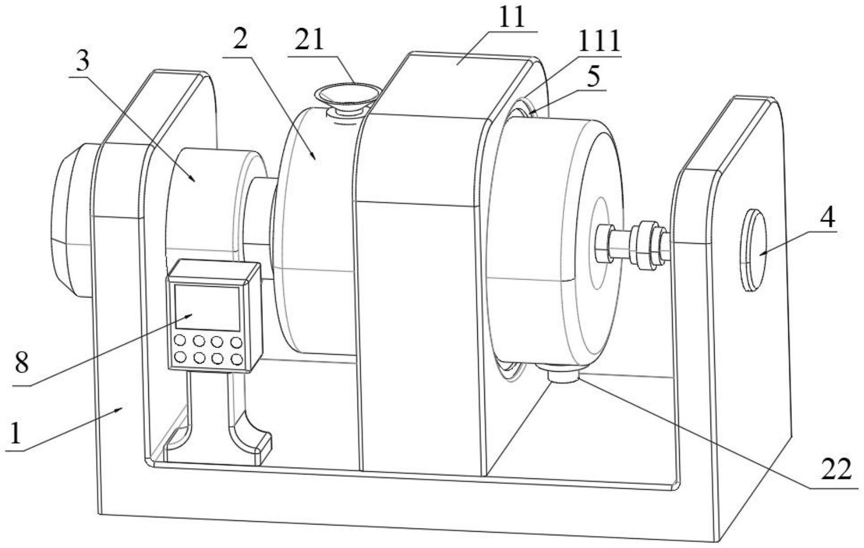 本实用新型涉及化工设备技术领域,具体为一种金属加工液加热搅拌反应釜,包括底座、釜体、正转驱动机构、搅拌组件、加热组件、反转驱动机构,所述釜体的两侧分别设置有进料口和出料口,所述进料口和出料口中分别设置有进料阀和出料阀;实际应用中,使用时,通过进料口进料,通过加热组件给金属加工液加热,通过正转驱动机构驱动釜体在底座上正转,使釜体内的金属加工液随釜体正转,有效防止金属加工液中较重的物质沉淀在釜体内壁底部,同时反转驱动机构驱动搅拌组件在釜体内部反转,将釜体内的金属加工液搅拌均匀;搅拌完成后,通过出料口出料;本实用新型能有效防止金属加工液中较重的物质沉淀在釜体内壁底部,搅拌更均匀。