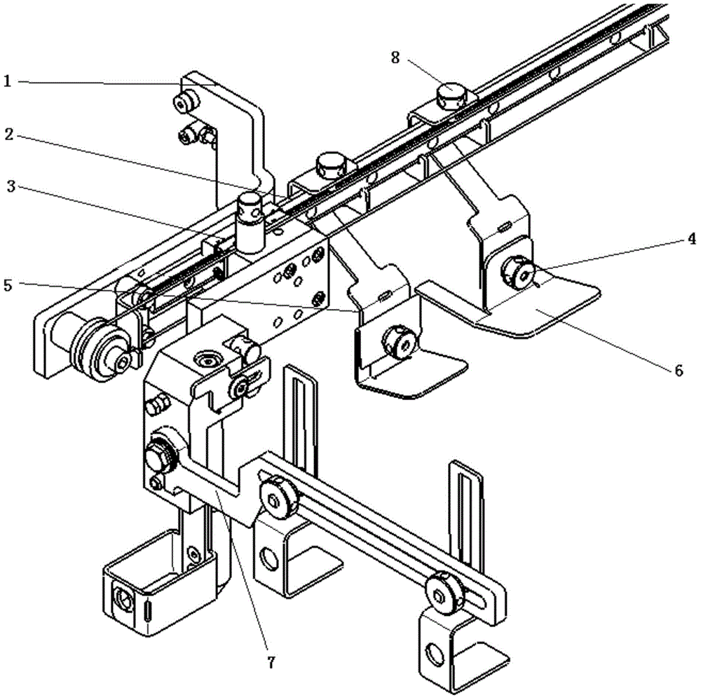 本实用新型涉及一种用于安装侧边吹嘴的直线导轨装置,该装置包括导轨支架、直线导轨及侧边吹嘴支架,所述的直线导轨左右两端分别设有导轨支架,所述的直线导轨上还布设有多个导向块,该导向块通过折弯滑板直接与直线导轨滑动连接,所述的侧边吹嘴支架通过滚珠滑块直接与直线导轨滑动连接,所述的导向块通过螺栓设置在折弯滑板的底部。与现有技术相比,本实用新型结构简单,实用性强,将导向块通过折弯滑板直接设置在直线导轨上,省去了原有装置中的导轨横梁,使得整个装置结构更加紧凑,有效节省空间,满足更多的纸张尺寸需求,能够适用于不同的工况条件,稳定可靠。