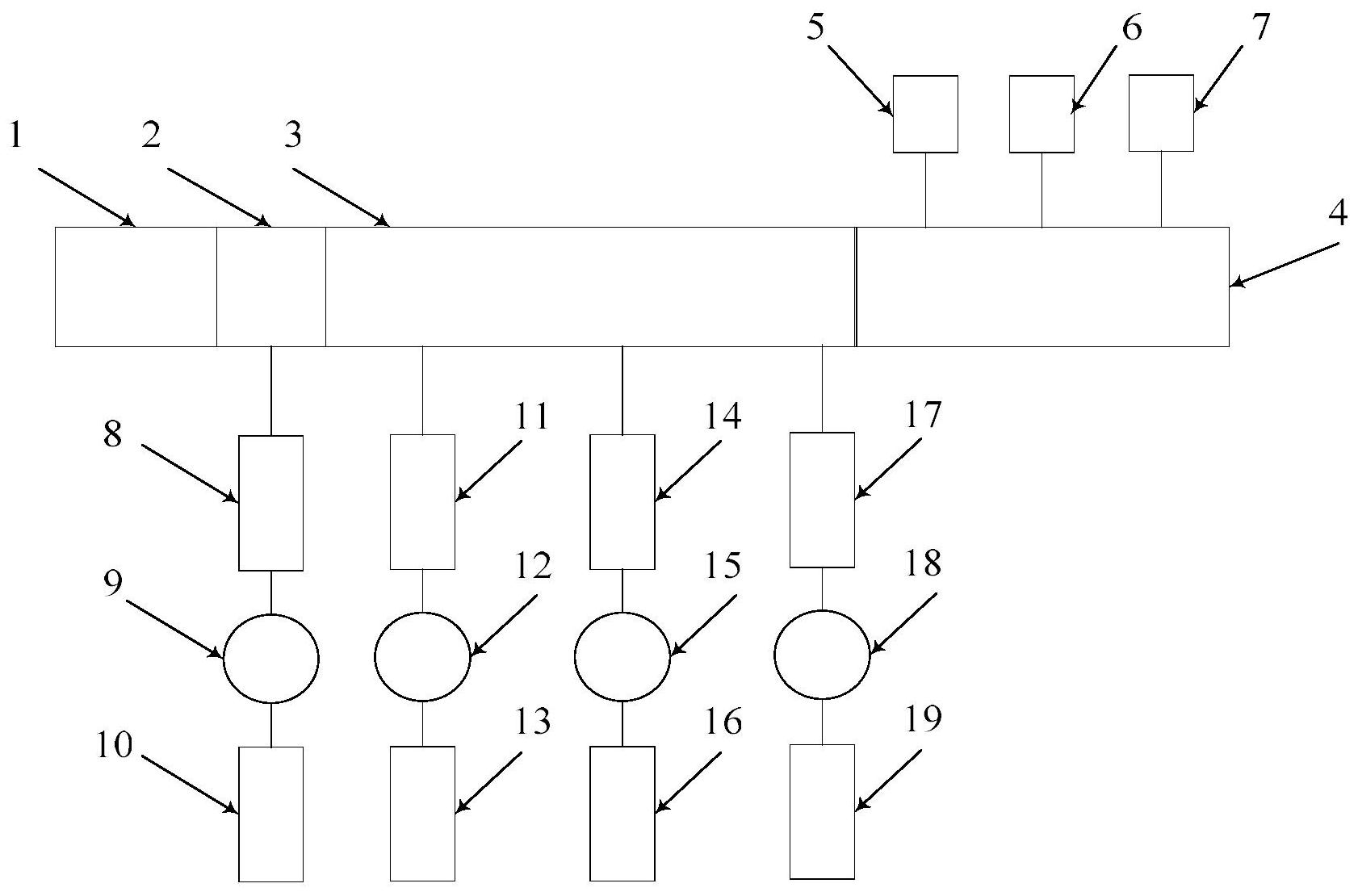 本发明公开了一种多工位卷取单元控制方法,基于多工位收卷控制系统,具体结构为:电源模块依次与PLC模块、模拟量输入输出模块3、数字量输入输出模块连接,PLC模块控制主胶辊伺服驱动器,主胶辊伺服驱动器控制控制主胶辊运行;模拟量输入输出模块分别控制回转架变频器、储料架变频器和收料变频器,回转架变频器、储料架变频器、收料变频器分别控制回转架电机驱动回转架、储料架电机驱动储料架和收料电机驱动收料轴运转;通过控制主胶辊及储料架速度,实现设备中料膜的同步性,通过控制器对收卷的逻辑控制,实现接料、换卷、更换收料轴等一系列动作,无需人工操作,减少失误率,实现在不停机情况下频繁换卷。