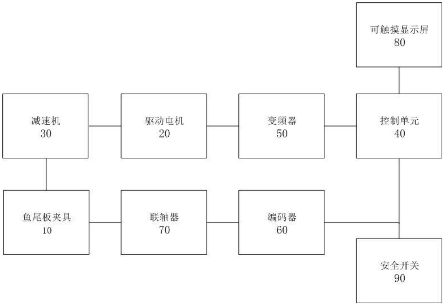 本实用新型提供了一种鱼尾板焊接工装,包括鱼尾板夹具、驱动电机、减速机、控制单元以及变频器;驱动电机与鱼尾板夹具连接以驱动鱼尾板夹具旋转;控制单元用于设定鱼尾板夹具的预期旋转角度并将预期旋转角度转换成频率信号下发;减速机与鱼尾板夹具和驱动电机均连接,减速机用于对驱动电机的降低回转数和增大转矩;变频器与控制单元和驱动电机均连接,变频器用于根据频率信号控制驱动电机的转速以改变鱼尾板夹具的旋转速度和旋转角度。解决了现有技术中的L68标节鱼尾板焊接工装无法控制翻转角度的问题。
