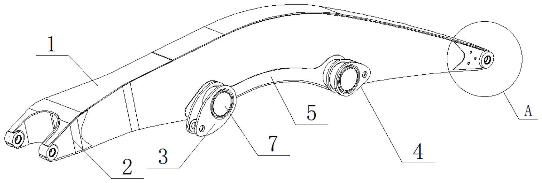 本实用新型公开了一种加强型挖掘机用动臂,它属于挖掘机连接件领域,其解决现有技术中挖掘机动臂中的动臂侧板容易产生裂纹,动臂的使用寿命缩短的问题。它主要包括动臂本体,所述动臂本体上设有固定管,所述动臂本体两端固定设有贴板Ⅰ,动臂本体中间位置设有贴板Ⅱ和固定管,所述贴板Ⅱ上开孔且穿过固定管,贴板Ⅱ与固定管焊接固定,所述的固定管上设有耳板,所述耳板包括动臂油缸耳板和斗杆油缸耳板,动臂油缸耳板连接动臂油缸,斗杆油缸耳板连接斗杆油缸。本实用新型主要采用增加加强贴板以及调整连接方式,可增强动臂结构强度,有效改善应力集中现象,从而增长动臂使用寿命。