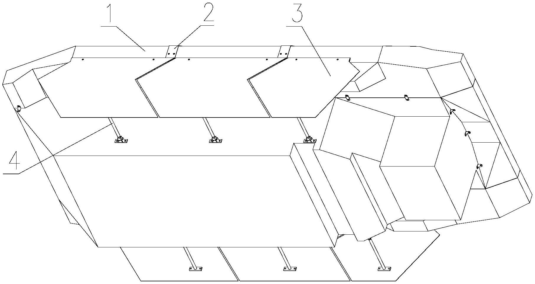 本实用新型公开了一种轮式无人车箱型分体式裙板装置,包括箱型结构、安装支架及两个下裙板;箱型结构为U形,箱型结构通过安装支架安装在车体的两侧和尾部,两个下裙板分别设置在车体的两侧,下裙板上端分别固定在箱型结构的底部。本实用新型结构简单,其能够有效遮蔽行动装置,减少行动装置的雷达和红外信号特征,下裙板距地高不大于50%轮高,正面、尾部在不影响通过性基础上,尽可能的加大遮挡面积。本实用新型的箱型结构及下裙板采用3mm厚的铝板制造,在保证功能的情况下,尽量减轻重量,具有简单可靠、外形美观、结构紧凑的优点。