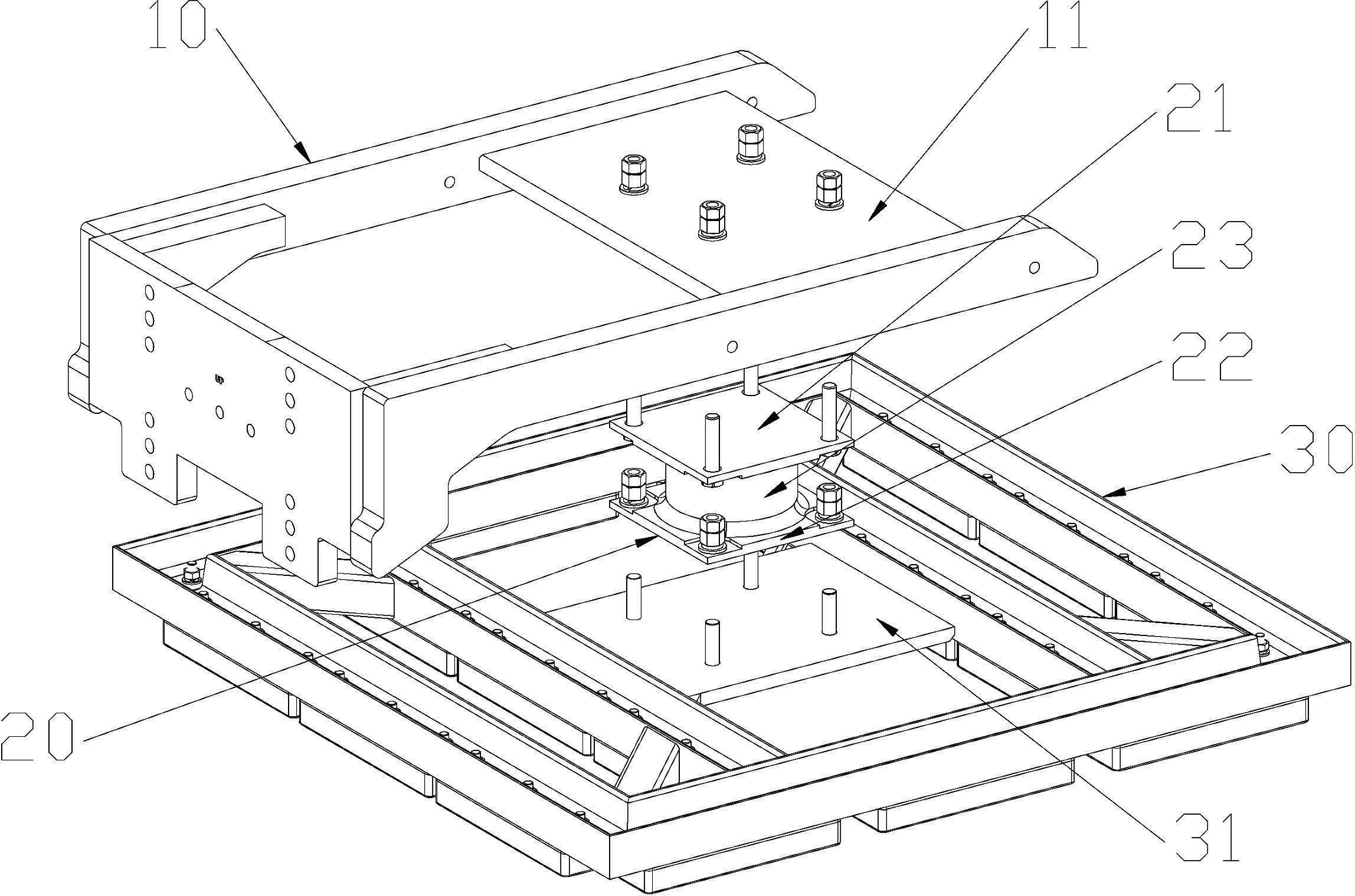 本实用新型公开一种货物稳定器的万向摆动式压板,包括一夹臂和一货物压板,一橡胶连接座弹性连接在夹臂和货物压板之间。橡胶连接座包括对应连接夹臂、货物压板的上、下刚性座体,和固定连接在上、下刚性座体之间的一橡胶块。所述上、下刚性座体分别通过螺栓对应可拆卸连接夹臂和货物压板。且所述夹臂与货物压板之间连接有保险钢丝绳。本实用新型万向摆动式压板可在任意方向小角度范围内摆动,以在各个方向压紧货物;螺栓连接的压板、橡胶连接座和夹臂,可以实现可拆卸目的;使用钢丝绳做为保险装置,可防止压板掉落砸伤人员。