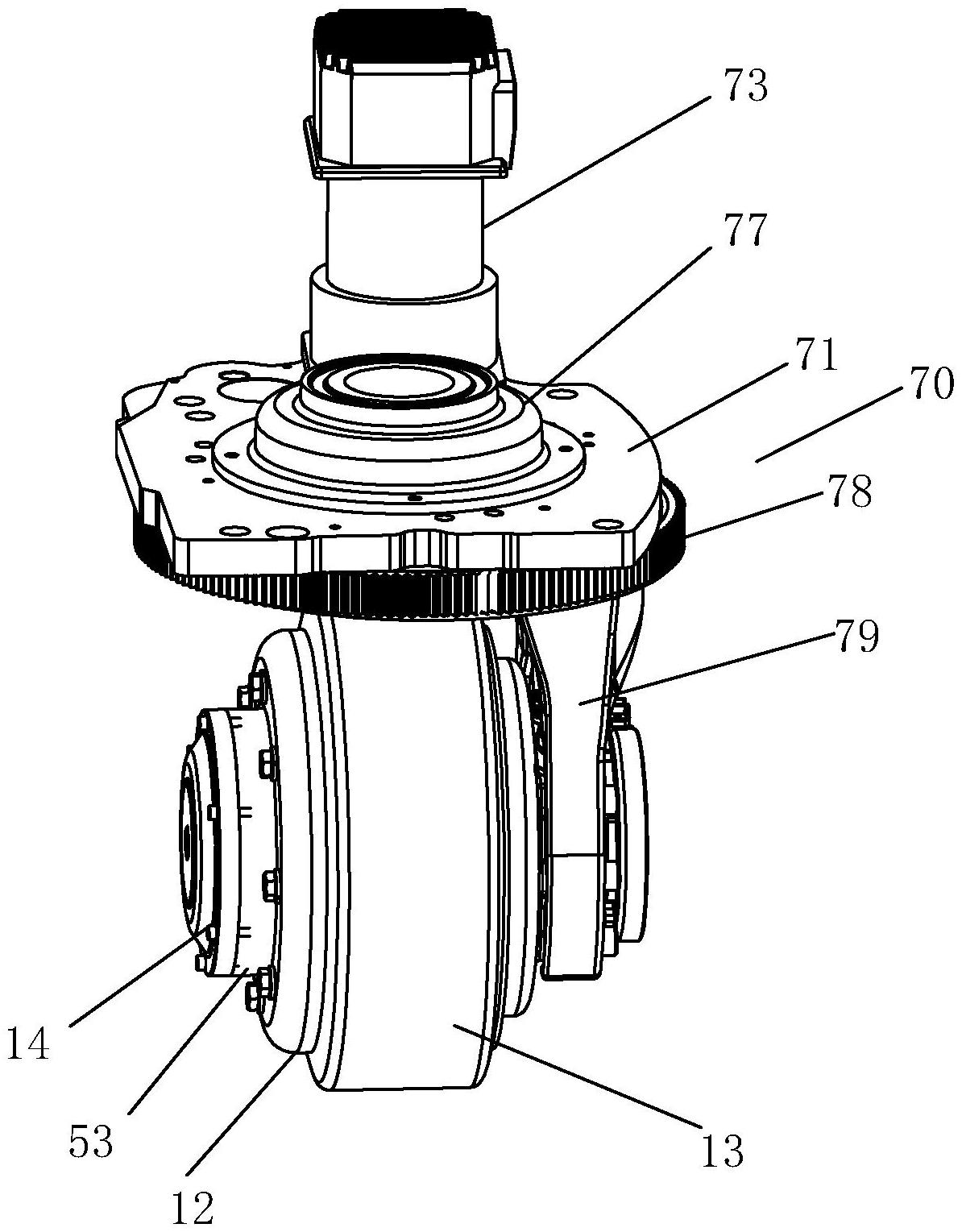 一种叉车的轮毂驱动装置和叉车,包括主轴、驱动电机和减速装置,主轴外套设有轴套,所述轴套外套设有轮毂,驱动电机和减速装置为沿所述主轴轴向分布;所述驱动电机固定于所述轴套内且连接驱动所述主轴相对所述轴套转动;所述减速装置位于所述轴套外且包括第一级行星减速机构和第二级行星减速机构;所述第一级行星减速机构的输入端与所述主轴传动连接以进行第一级减速,所述第一级行星减速机构的输出端与所述第二级行星减速机构的输入端传动连接以进行第二级减速;所述第二级行星减速机构的输出端与所述轮毂相固定。本实用新型可减少驱动装置在纵向上的尺寸,并且高度集成化,给叉车本体内其他部件的布置留下更大空间,减小叉车尺寸、实现小型化。