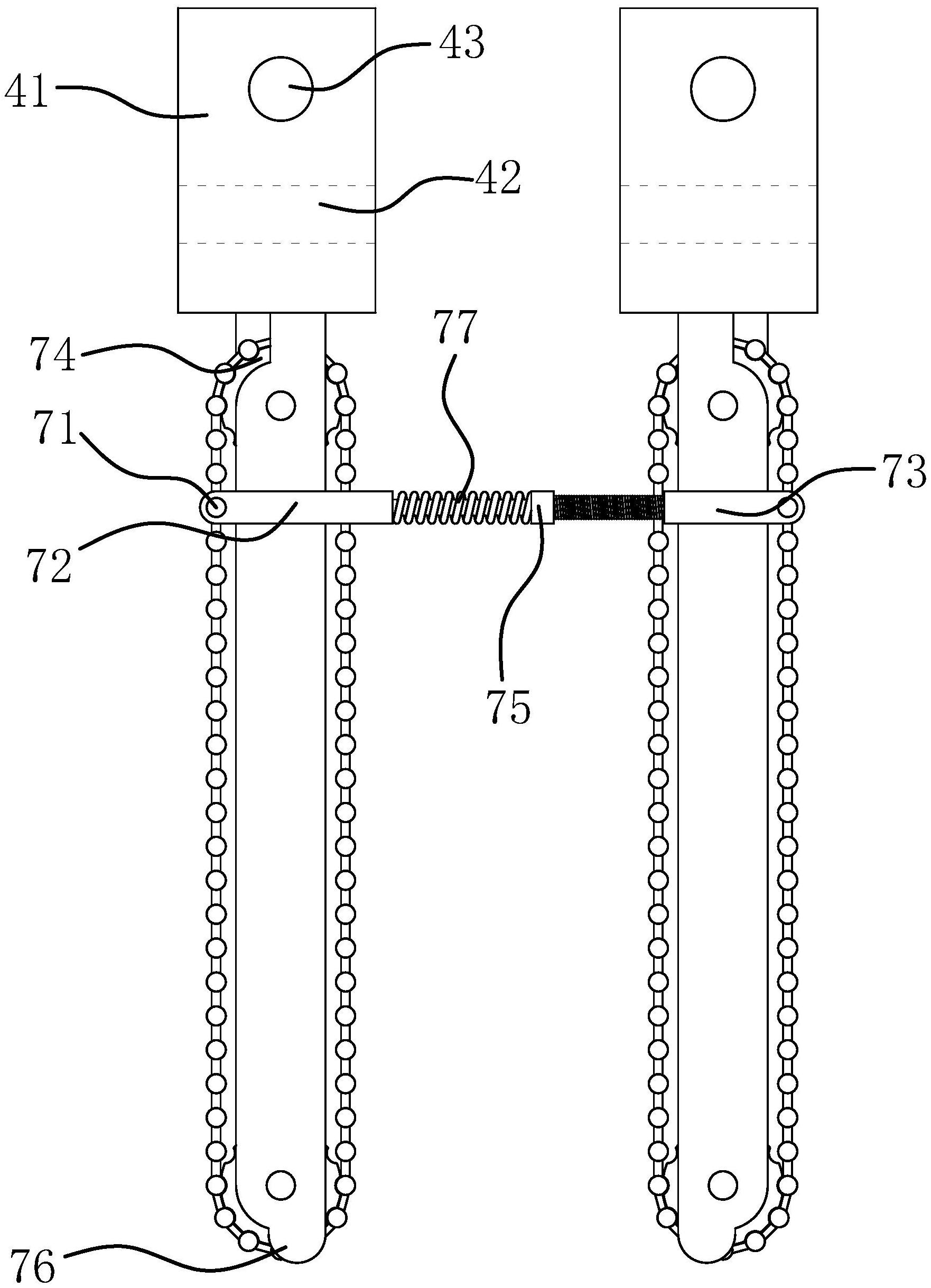 本实用新型提供了一种搬运车上的自适应组合叉臂,属于物流设备技术领域。包括车架和横向滑动连接在车架上的两个叉臂,叉臂包括底板与底板固定相连的顶板,底板与顶板之间转动连接有两个转轮,两个转轮之间连接有一横向链条,横向链条由相间设置的第二导柱和铰接相连第二导柱的第二连接板组成,第二导柱上转动连接有一套管,转轮的周面上具有与第二导柱适配的第二限位槽,第二导柱运动轨迹的外廓超出叉臂的前端和两侧。本实用新型具有操作轻便、载货效率高等优点。