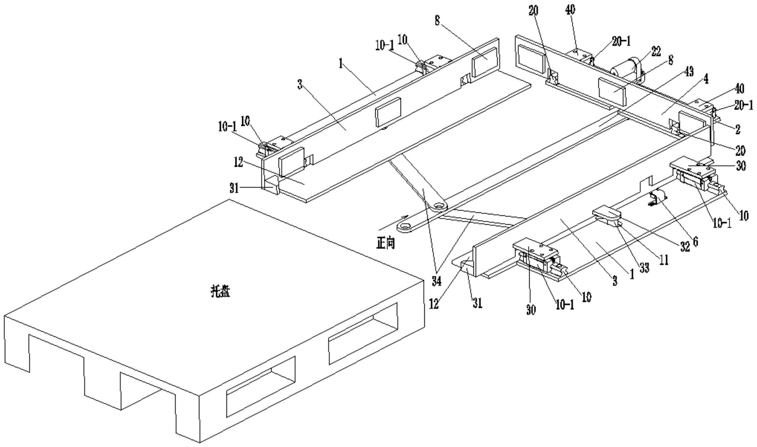 本发明公开了一种托盘联动校准装置及方法,包括底板一、底板二、侧推板、正推板、限位开关座和在席开关;底板一上设有导轨一,底板一中间设有限位孔一;底板二上设有导轨二,底板二上设有限位孔二,底板二上设有电动推杆;侧推板设有连接板一;正推板设有连接板二;限位开关座与底板二连接,在席开关与底板一连接;侧推板设有延伸板一,延伸板一下端设有限位销,限位销下端铰接连杆一;正推板设有延伸板二,延伸板二下端设有限位轴,限位轴下端连接连杆二;两个连杆一端部都与连杆二铰接;避免人工放置误差,损伤托盘,安全隐患,提高校准效率;保证托盘使用寿命;提高对托盘限位范围;实现限位精度调整;满足其他机器人精度对接要求。