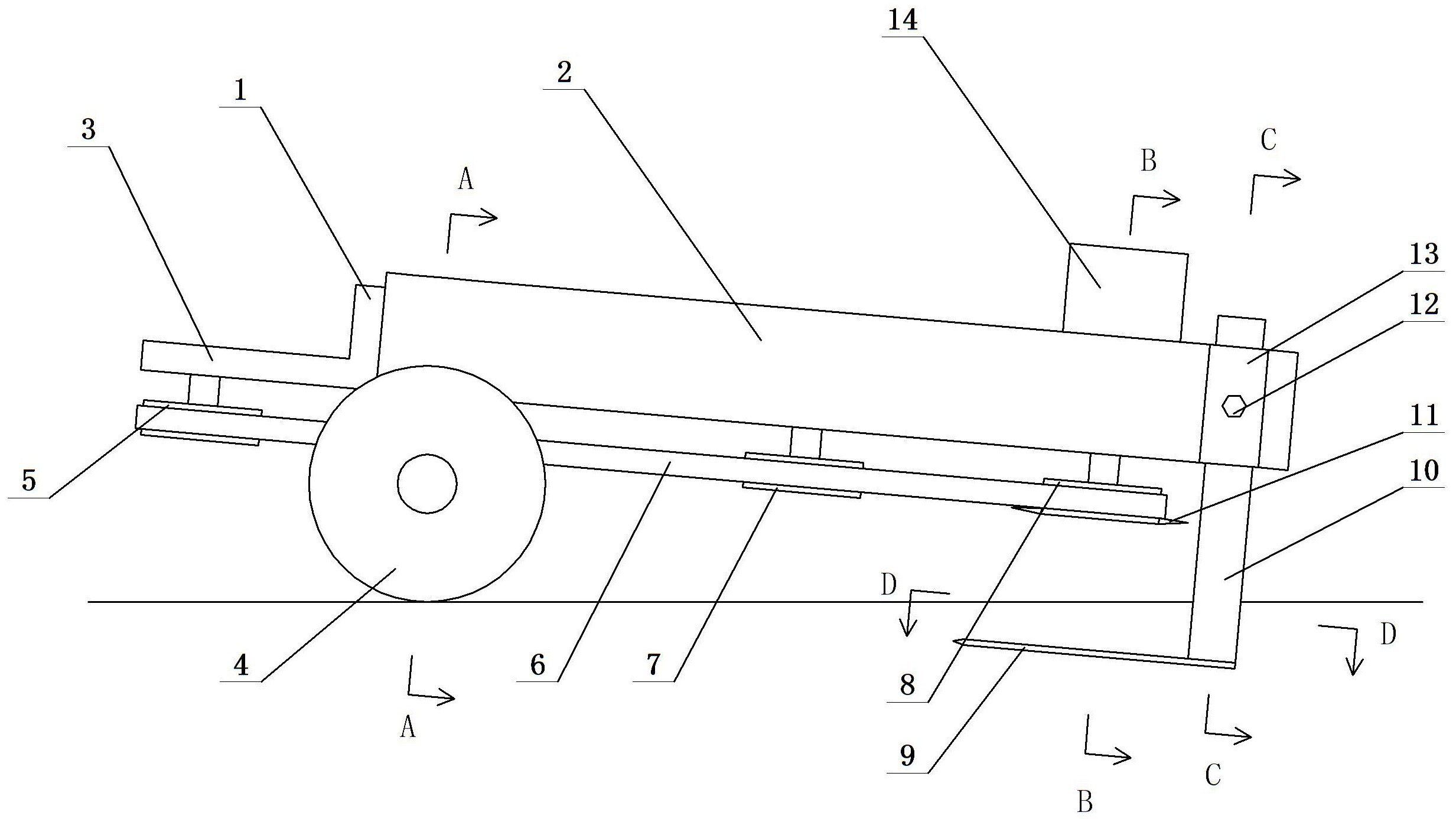 本实用新型涉及花生收获设备技术领域,具体的,涉及一种花生收获装置,该花生收获装置包括顶架,顶架下部连接有两件底架,两件底架之间具有沿前后方向延伸的空隙,底架下部前端远离空隙的一侧转动连接有由带轮驱动装置驱动的主动带轮,底架下部中段靠近空隙的一侧转动连接有张紧带轮,底架下部后端靠近空隙的一侧转动连接有从动带轮,主动带轮、张紧带轮及从动带轮上缠绕有皮带,顶架左右两侧均安装有由侧架驱动装置驱动、能够靠近或远离顶架的侧架,侧架后端外侧安装有车轮,侧架前端下部安装有向内侧倾斜设置的松土刀。本实用新型的有益效果在于:收获效率高,方便适应不同宽度的种植地块的田埂。