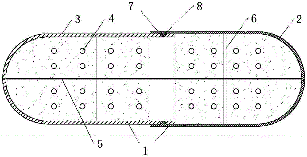 一种长效干扰素胶囊,包括容纳长效干扰素药物颗粒的胶囊壳(1),胶囊壳(1)包括胶囊帽(2)与胶囊体(3),在胶囊帽(2)与胶囊体(3)上均匀分布有贯通的小孔(4),并且在胶囊帽(2)与胶囊体(3)内表面上设置有加强筋(5);在胶囊体(3)上设置有环形凹槽(7),在胶囊帽(2)上设置有能够与环形凹槽(7)配合安装的环形凸起(8);在胶囊帽(2)与胶囊体(3)内均设置有缓冲板(6)。本实用新型设计简单合理,结构更加稳定,与现有技术相比,胶囊装入长效干扰素药物颗粒的胶囊帽与胶囊体对接更加完美,有效地防止了在生产与使用的过程中胶囊体与胶囊帽的分离,防止了长效干扰素药物颗粒的外泄。