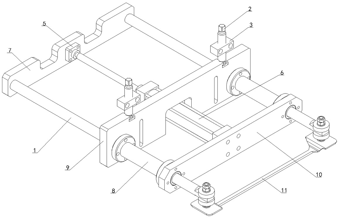 一种双轴单气缸热切刀,包括固定板和气缸载板,固定板和气缸载板之间设置有两个连接套,两个连接套的两端分别与固定板和气缸载板的左右两端相连;两个连接套内部均以可移动方式设置有导杆,两个导杆的一端连接有活动板,两个导杆的另一端连接有刀片;还包括气缸,气缸的一端固定在气缸载板的中部,气缸的另一端与活动板的中部相连;优化了新的运行机构,采用单一气缸中间位置固定,保证动力源稳定且在中心位置,双导杆连接使整体的运行更加的稳定,方向不易偏差,开合过程稳定高效快速,长时间运行也不会出现卡死等情况;刀片通电加热可长时间使用不变形,大大降低了成本。