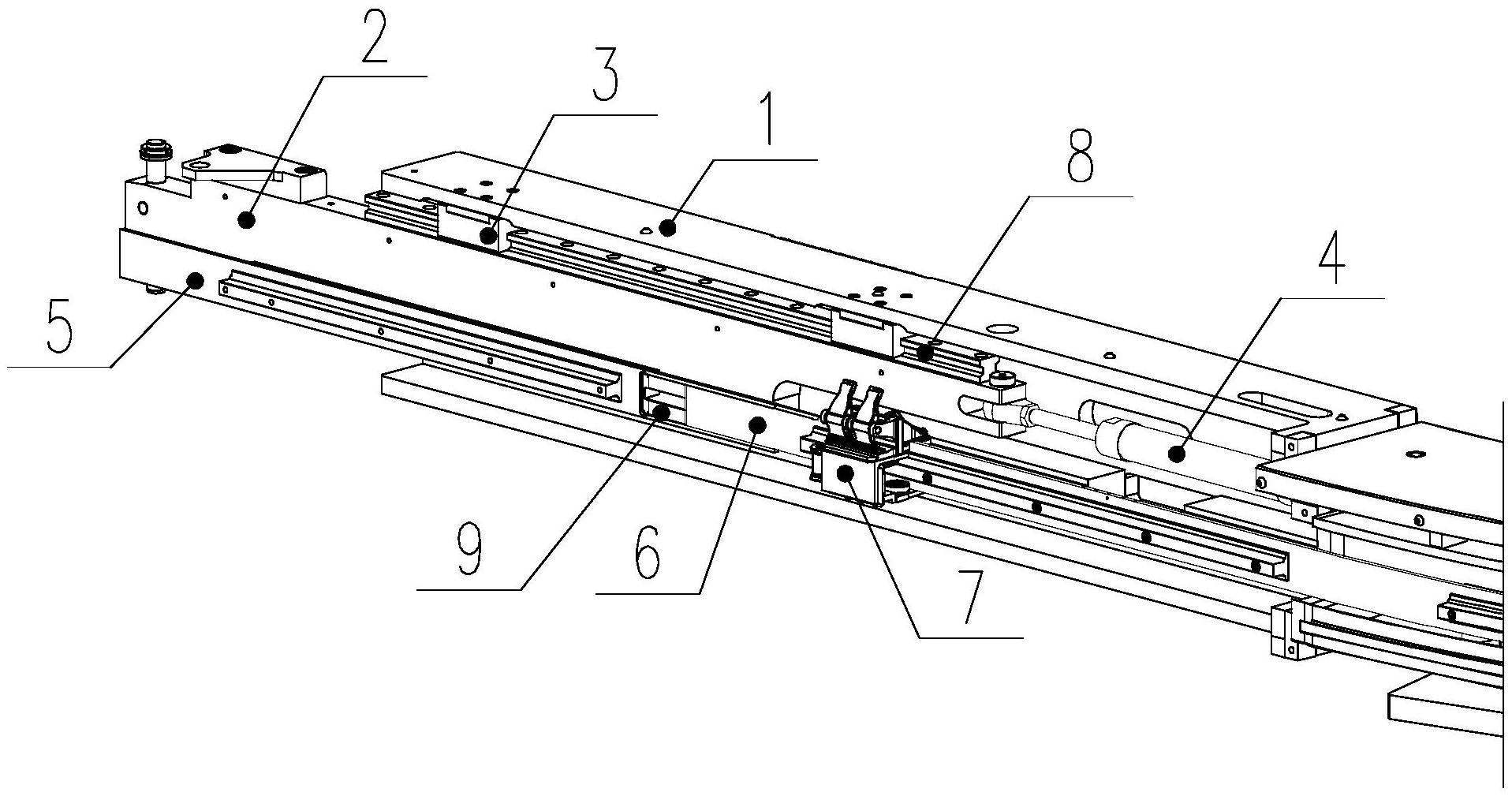 本实用新型公开了一种链轨张紧机构,固定框架设置在链轨的轨道内,且位于链轨入口端,固定框架内设置有可动轨道梁和驱动件,张紧组件包括设置在可动轨道梁上的轨道板A和设置在固定框架上的轨道板B,轨道板A与轨道板B对应插接,且可相对滑动。通过驱动件驱动可动轨道梁在固定框架上进行滑动,进而通过可动轨道梁带动轨道板A相对轨道板B进行前后滑动,可以调松链轨,以此对链轨实现张紧调节。相比传统的链轨系统张紧多为入口转盘组件与出口转盘组件整体移动、通过加大出入口转盘之间的距离实现张紧的设置,本申请中的张紧装置可藏于轨道内部,结构排布紧凑,空间利用率高,便于维护与拆卸更换,油缸的推力利用率高,更具经济性。