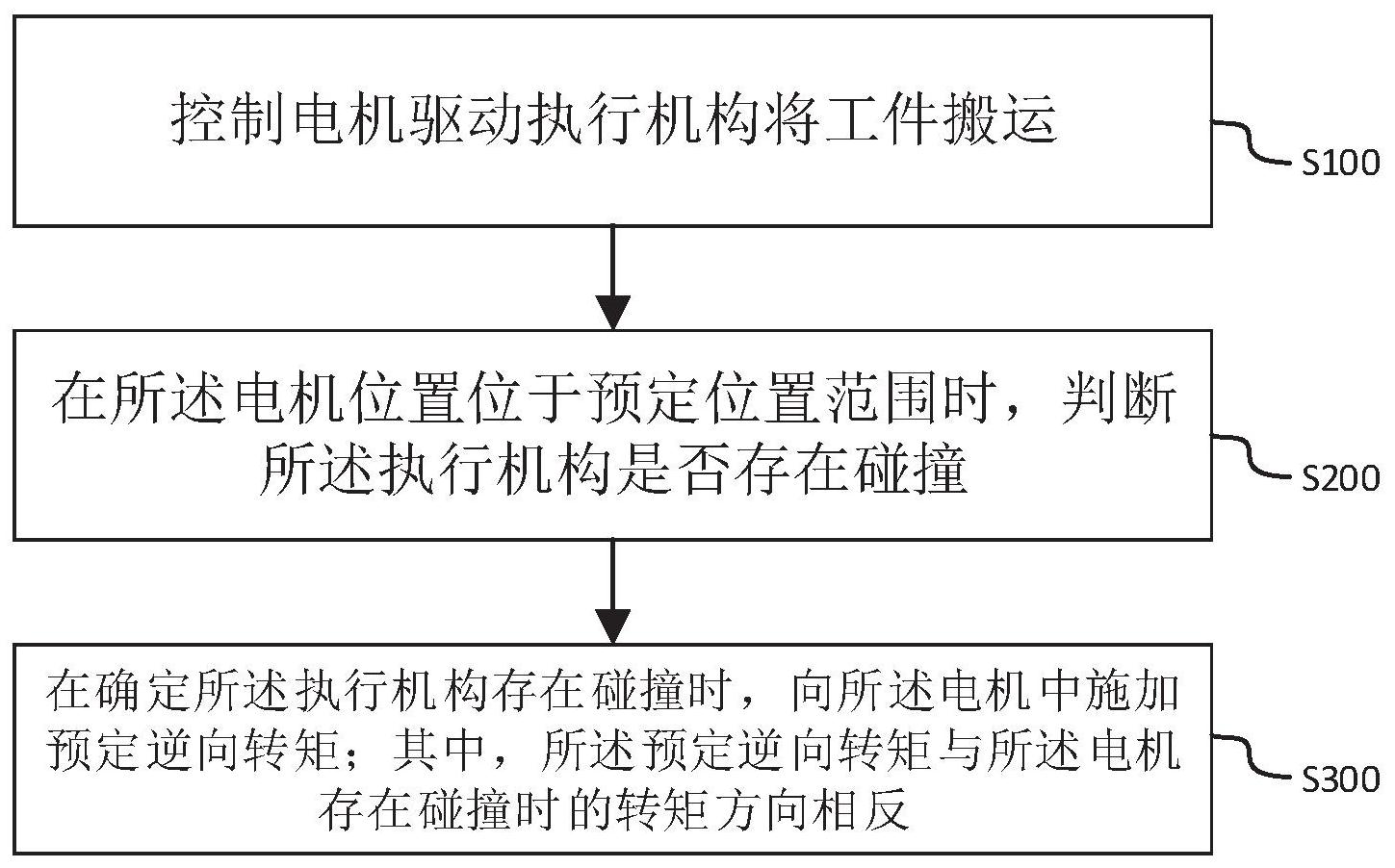 本申请公开一种工件搬运装置、工件搬运控制方法及控制器。其中,一种工件搬运装置,包括:电机、能被所述电机驱动的执行机构、以及与所述电机连接的控制器;所述控制器用于控制所述电机驱动所述执行机构将工件搬运;所述控制器在确定所述执行机构存在碰撞时,向所述电机中施加预定逆向转矩;其中,所述预定逆向转矩与所述电机存在碰撞时的转矩方向相反。本申请所提供的工件搬运装置、工件搬运控制方法及控制器能够在搬运工件发生碰撞时避免工件或搬运工具受损。